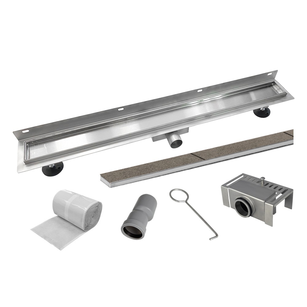 Odtokový žlab je dodáván včetně roštu TILE. Rošt je možné použít jako variantu, kdy je vidět jednolitá nerezová plocha, nebo je možné do roštu nalepit přímo dlažbu. Obě varianty působí velmi jednoduše a čistě, přičemž druhá varianta udělá ze žlabu nenápadný doplněk sprchového koutu, který skvěle splyne s ostatní dlažbou.
