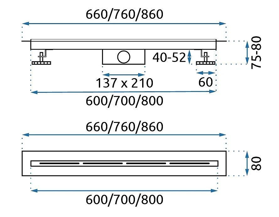 Odtokový žlab je celý vyroben z kyselinovzdorné nerezové oceli Aisi 304. Je vybaven řadou inovativních technologií, které usnadňují montáž a každodenní používání. V odtoku je použit dvojitý filtrační systém, který dokonale zabraňuje vnikání nečistot a předmětů, které mohou blokovat odtok vody do kanalizace. Výhodou tohoto systému je snadné čištění. Sada obsahuje: nohy, sifon, Dry-Fix manžetu, košík, uživatelskou příručku a háček na výměnu krytu žlabu.