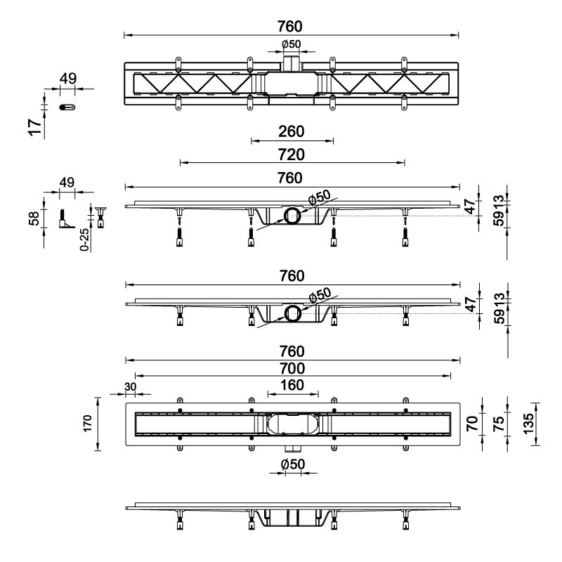 Kvalitně a moderně zpracovaný odtokový žlab, vyroben kombinací pevného plastu a nerezového roštu s povrchovou úpravou v černé barvě, obohatí každou koupelnu o nádech luxusu.