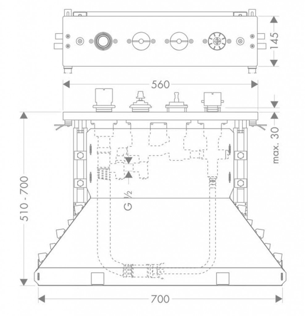 Základní těleso pro čtyřotvorovou vanovou baterii pro montáž na sokl s termostatem