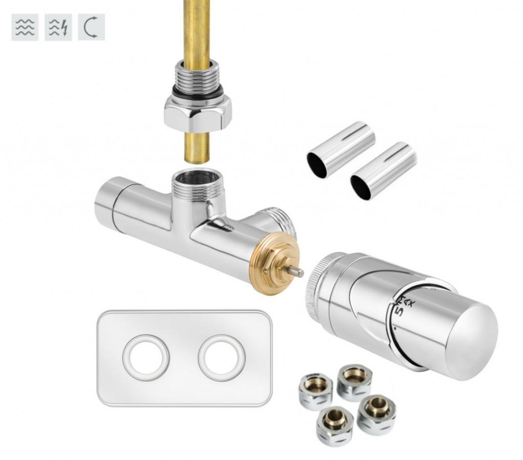 Jednobodová oboustranná (levá i pravá) termostatická sada ONE vč. krycí rozety a 2 krycích trubiček (mosaz) je určena pro připojení radiátorů na rozvody TUV s vývodem ze zdi s roztečí 50mm.
