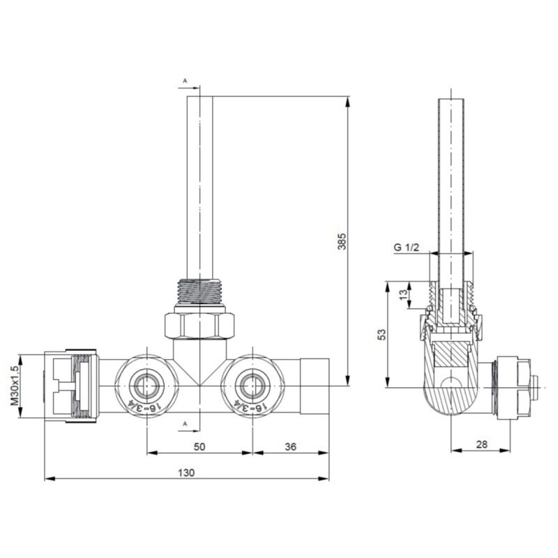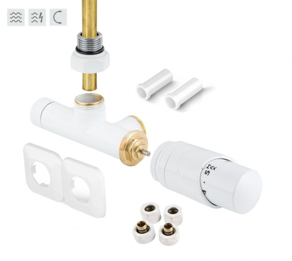 Jednobodová oboustranná (levá i pravá) termostatická sada ONE vč. krycí rozety a 2 krycích trubiček (plast) je určena pro připojení radiátorů na rozvody TUV s vývodem ze zdi s roztečí 50mm.