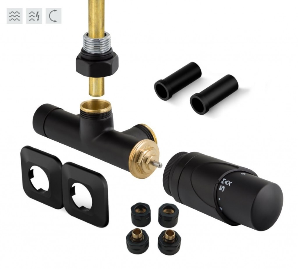 Jednobodová oboustranná (levá i pravá) termostatická sada ONE vč. krycí rozety a 2 krycích trubiček (plast) je určena pro připojení radiátorů na rozvody TUV s vývodem ze zdi s roztečí 50mm.
