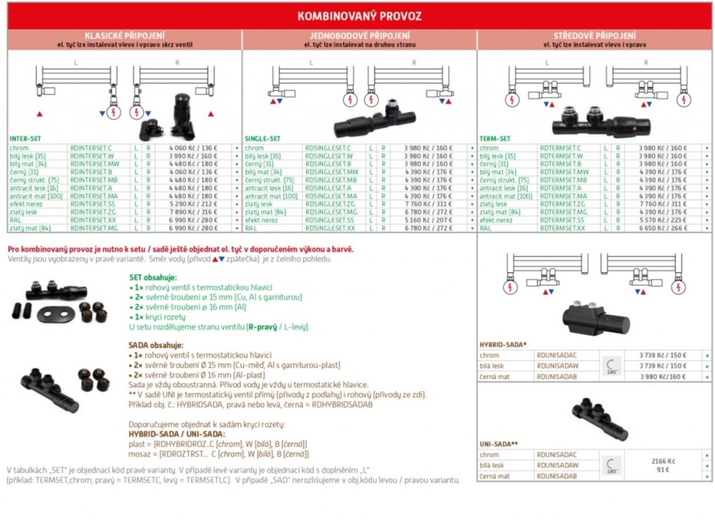 Pro kombinovaný provoz u klasických radiátorů musíte objednat sadu + el. tyč v doporučeném výkonu, kterou můžete instalovat vlevo nebo vpravo do radiátoru.