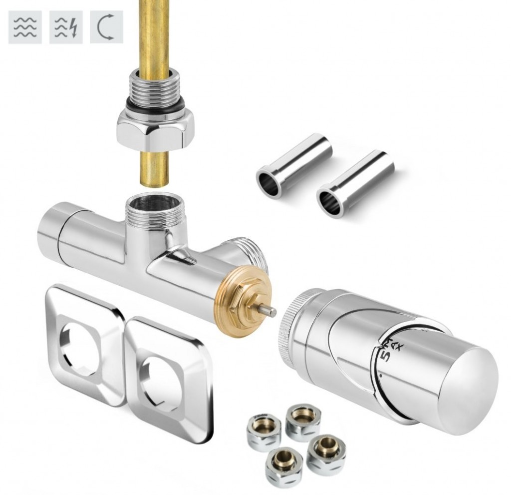 Jednobodová oboustranná (levá i pravá) termostatická sada ONE vč. krycí rozety a 2 krycích trubiček (plast) je určena pro připojení radiátorů na rozvody TUV s vývodem ze zdi s roztečí 50mm.