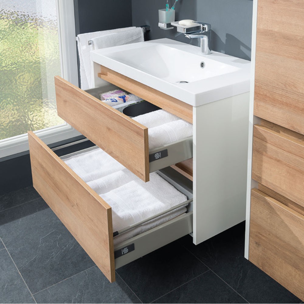Série koupelnového nábytku Opto umožňuje kombinovat skříňky do mnoha různých variant. Vytvořit tak lze jak složité kombinace do velkých koupelen, tak minimalistické řešení v moderním designu. Šuplíky jsou osazeny značkovými pojezdy Strong s pomalým dovíráním. Na výběr je ze tří barevných kombinací, bílá lesk, dub Riviera a černá supermat. Skříňky mají laserové opracování hran a jsou dodávány smontované a všechny jsou určené k zavěšení.