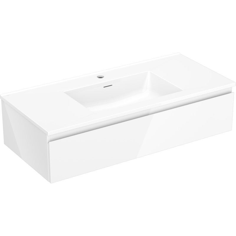 Specifikace produktu: Rozměry skříňky: Šířka: 100 cm Hloubka: 46 cm Výška: 23,5 cm Barva korpusu: Lesklá bílá Materiál korpusu: Lakovaná deska Barva čela: Lesklá bílá Materiál čela: Lakovaná MDF deska Struktura čela: Hladká Počet zásuvek: 1 Prostorná zásuvka s funkcí tlumeného dovírání Povrch odolný vůči UV záření Rozměry umyvadla: Šířka: 101 cm Hloubka: 46,5 cm Výška: 16,5 cm Barva umyvadla: Lesklá bílá Materiál umyvadla: Konglomerát Otvor pro přepad: Ano Otvor pro baterii: Ano Smontovaný výrobek