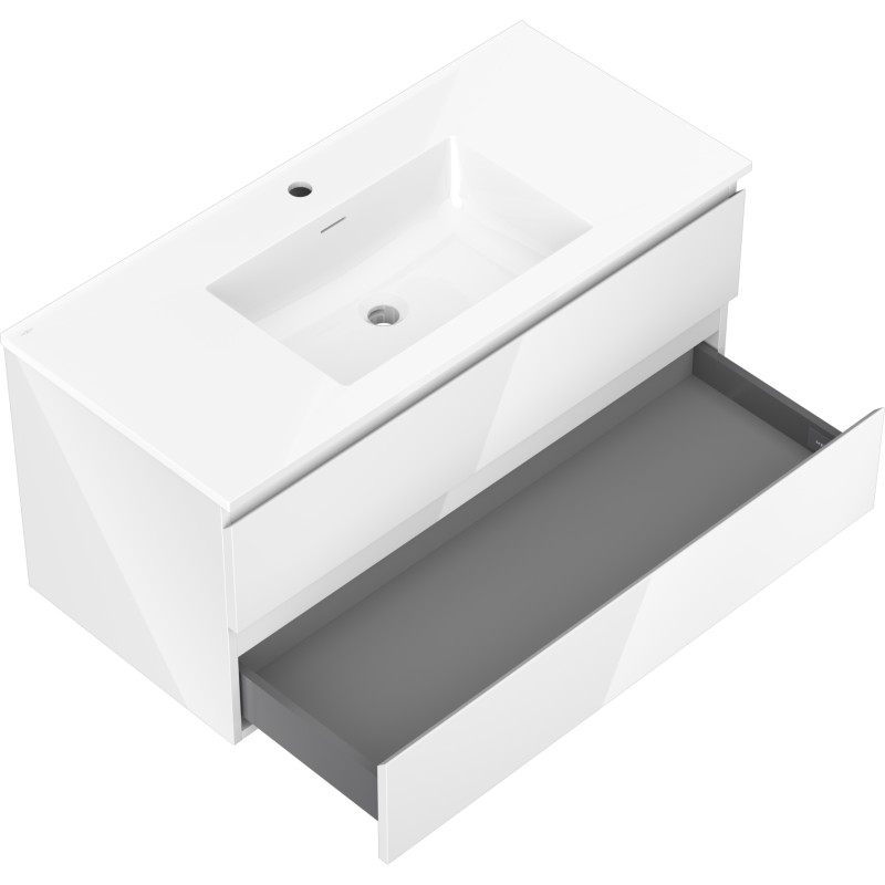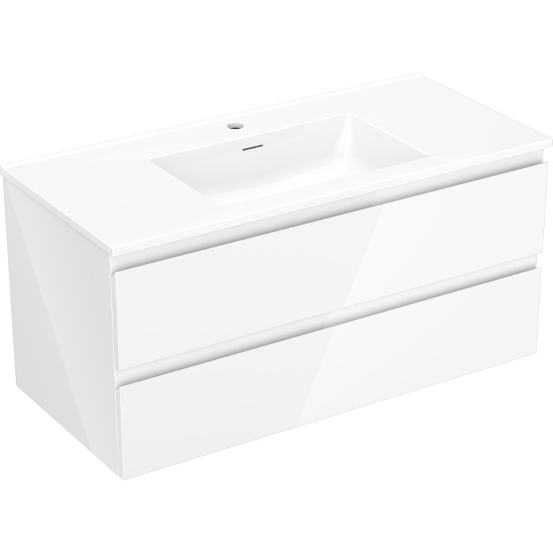 Specifikace produktu: Rozměry skříňky: Šířka: 100 cm Hloubka: 46 cm Výška: 47 cm Barva korpusu: Lesklá bílá Materiál korpusu: Lakovaná deska Barva čela: Lesklá bílá Materiál čela: Lakovaná MDF deska Struktura čela: Hladká Počet zásuvek: 2 Prostorná zásuvka s funkcí tichého dovírání Povrch odolný vůči UV záření Rozměry umyvadla: Šířka: 101 cm Hloubka: 46,5 cm Výška: 16,8 cm Barva umyvadla: Lesklá bílá Materiál umyvadla: Konglomerát Otvor pro přepad: Ano Otvor pro baterii: Ano Smontovaný výrobek
