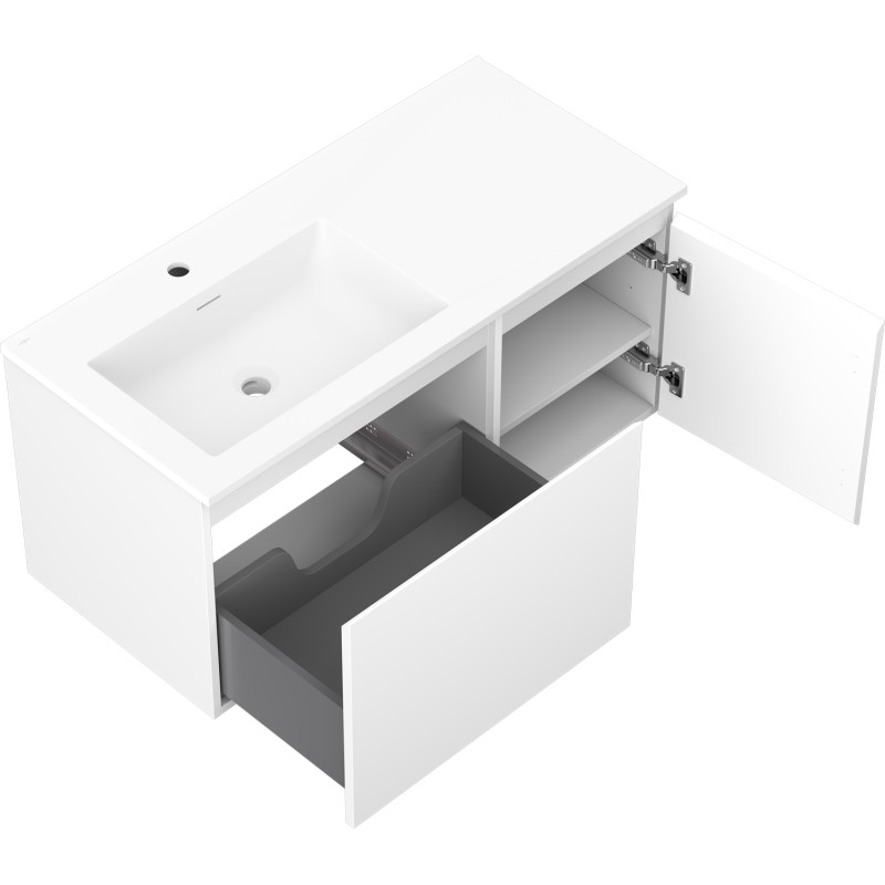 Specifikace produktu: Rozměry skříňky: Šířka: 100 cm Hloubka: 46 cm Výška: 47 cm Sada obsahuje: Zásuvková skříňka pod umyvadlo: Šířka: 60 cm Hloubka: 46 cm Výška: 47 cm Barva korpusu: Matná bílá Materiál korpusu: Lakovaná deska Barva čela: Matná bílá Materiál čela: Lakovaná MDF deska Konstrukce čela: Hladká Počet zásuvek: 1 Prostorná zásuvka s funkcí tlumeného dovírání Umyvadlová skříňka s dvířky: Šířka: 40 cm Výška: 47 cm Hloubka: 46 cm Barva korpusu: Matná bílá Materiál korpusu: Lakovaná deska Barva čela: Matná bílá Materiál čela: Lakovaná MDF deska Konstrukce čela: Hladká Počet dvířek: 1 1 police Panty s funkcí tlumeného dovírání Univerzální montáž dvířek (levé/pravé) Povrch odolný vůči UV záření Umyvadlo: Šířka: 101 cm Hloubka: 46,5 cm Výška: 16,5 cm Barva umyvadla: Matná bílá Materiál umyvadla: Konglomerát Otvor pro přepad: Ano Otvor pro baterii: Ano Produkt smontovaný