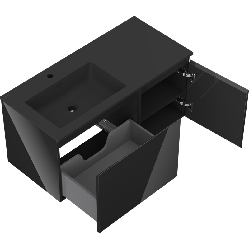 Specifikace produktu: Rozměry skříňky: Šířka: 100 cm Hloubka: 46 cm Výška: 47 cm Sada obsahuje: Zásuvková skříňka pod umyvadlo: Šířka: 60 cm Hloubka: 46 cm Výška: 47 cm Barva korpusu: Černý lesk Materiál korpusu: Lakovaná deska Barva čela: Černý lesk Materiál čela: Lakovaná MDF Struktura čela: Hladká Počet zásuvek: 1 Prostorná zásuvka s funkcí tlumeného dovírání Umyvadlová skříňka s dvířky: Šířka: 40 cm Výška: 47 cm Hloubka: 46 cm Barva korpusu: Černý lesk Materiál korpusu: Lakovaná deska Barva čela: Černý lesk Materiál čela: Lakovaná MDF Struktura čela: Hladká Počet dvířek: 1 1 police Panty s funkcí tlumeného dovírání Univerzální montáž dvířek (levé/pravé) UV odolný povrch Umyvadlo: Šířka: 101 cm Hloubka: 46,5 cm Výška: 16,5 cm Barva umyvadla: Matná černá Materiál umyvadla: Konglomerát Otvor pro přepad: Ano Otvor pro baterii: Ano Smontovaný výrobek