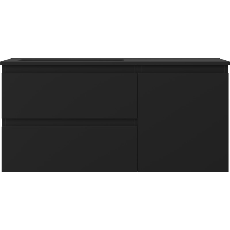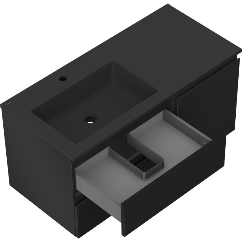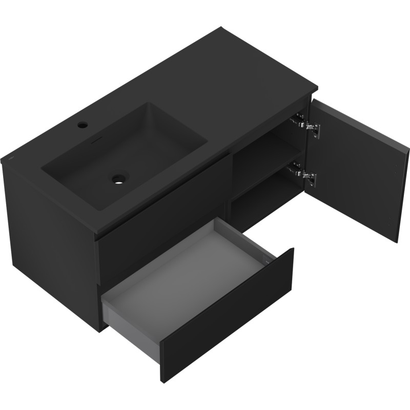 Specifikace produktu: Rozměry skříňky: Šířka: 100 cm Hloubka: 46 cm Výška: 47 cm Sada obsahuje: Zásuvková skříňka pod umyvadlo: Šířka: 60 cm Hloubka: 46 cm Výška: 47 cm Barva korpusu: Matná černá Materiál korpusu: Lakovaná deska Barva čela: Matná černá Materiál čela: Lakovaná MDF deska Konstrukce čela: Hladká Počet zásuvek: 2 Prostorná zásuvka s funkcí tlumeného dovírání Umyvadlová skříňka s dvířky: Šířka: 40 cm Výška: 47 cm Hloubka: 46 cm Barva korpusu: Matná černá Materiál korpusu: Lakovaná deska Barva čela: Matná černá Materiál čela: Lakovaná MDF deska Konstrukce čela: Hladká Počet dvířek: 1 1 police Panty s funkcí tlumeného dovírání Univerzální montáž dvířek (levé/pravé) Povrch odolný vůči UV záření Umyvadlo: Šířka: 101 cm Hloubka: 46,5 cm Výška: 16,5 cm Barva umyvadla: Matná černá Materiál umyvadla: Konglomerát Otvor pro přepad: Ano Otvor pro baterii: Ano Výrobek smontovaný