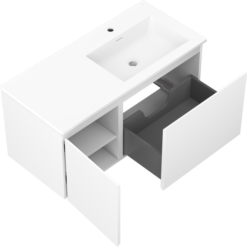 Specifikace produktu: Rozměry skříňky: Šířka: 100 cm Hloubka: 46 cm Výška: 47 cm Sada obsahuje: Zásuvková skříňka pod umyvadlo: Šířka: 60 cm Hloubka: 46 cm Výška: 47 cm Barva korpusu: Matná bílá Materiál korpusu: Lakovaná deska Barva čela: Matná bílá Materiál čela: Lakovaná MDF deska Konstrukce čela: Hladká Počet zásuvek: 1 Prostorná zásuvka s funkcí tlumeného dovírání Umyvadlová skříňka s dvířky: Šířka: 40 cm Výška: 47 cm Hloubka: 46 cm Barva korpusu: Matná bílá Materiál korpusu: Lakovaná deska Barva čela: Matná bílá Materiál čela: Lakovaná MDF deska Konstrukce čela: Hladká Počet dvířek: 1 1 police Panty s funkcí tlumeného dovírání Univerzální montáž dvířek (levé/pravé) Povrch odolný vůči UV záření Umyvadlo: Šířka: 101 cm Hloubka: 46,5 cm Výška: 16,5 cm Barva umyvadla: Matná bílá Materiál umyvadla: Konglomerát Otvor pro přepad: Ano Otvor pro baterii: Ano Produkt smontovaný