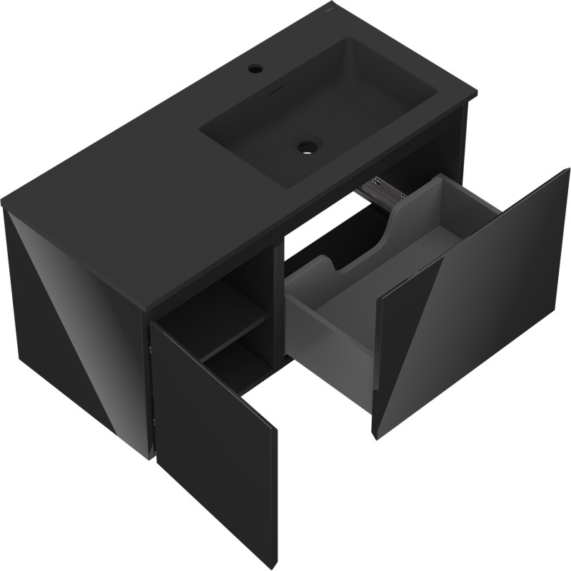 Specifikace produktu: Rozměry skříňky: Šířka: 100 cm Hloubka: 46 cm Výška: 47 cm Sada obsahuje: Zásuvková skříňka pod umyvadlo: Šířka: 60 cm Hloubka: 46 cm Výška: 47 cm Barva korpusu: Černý lesk Materiál korpusu: Lakovaná deska Barva čela: Černý lesk Materiál čela: Lakovaná MDF Struktura čela: Hladká Počet zásuvek: 1 Prostorná zásuvka s funkcí tlumeného dovírání Umyvadlová skříňka s dvířky: Šířka: 40 cm Výška: 47 cm Hloubka: 46 cm Barva korpusu: Černý lesk Materiál korpusu: Lakovaná deska Barva čela: Černý lesk Materiál čela: Lakovaná MDF Struktura čela: Hladká Počet dvířek: 1 1 police Panty s funkcí tlumeného dovírání Univerzální montáž dvířek (levé/pravé) UV odolný povrch Umyvadlo: Šířka: 101 cm Hloubka: 46,5 cm Výška: 16,5 cm Barva umyvadla: Matná černá Materiál umyvadla: Konglomerát Otvor pro přepad: Ano Otvor pro baterii: Ano Smontovaný výrobek