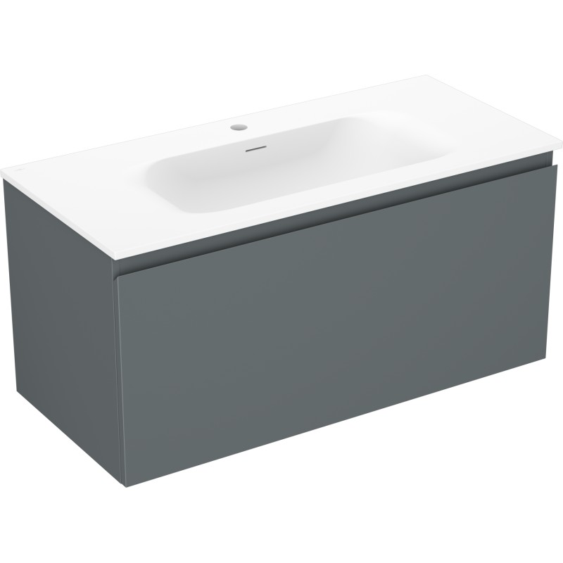 Specifikace produktu: Rozměry skříňky: Šířka: 100 cm Hloubka: 46 cm Výška: 47 cm Barva korpusu: Matný grafit Materiál korpusu: Lakovaná deska Barva čela: Matný grafit Materiál čela: Lakovaná MDF deska Struktura čela: Hladká Počet zásuvek: 1 Prostorná zásuvka s funkcí tlumeného dovírání Povrch odolný vůči UV záření Rozměry umyvadla: Šířka: 101 cm Hloubka: 46,5 cm Výška: 16,5 cm Barva umyvadla: Matná bílá Materiál umyvadla: Konglomerát Otvor pro přepad: Ano Otvor pro baterii: Ano Smontovaný výrobek
