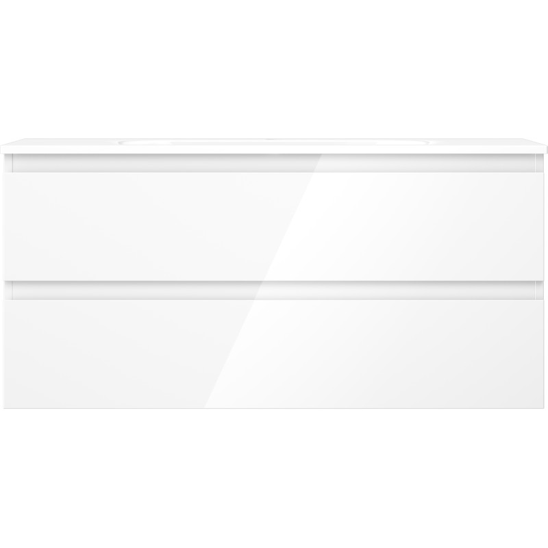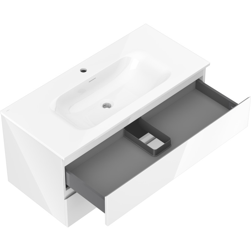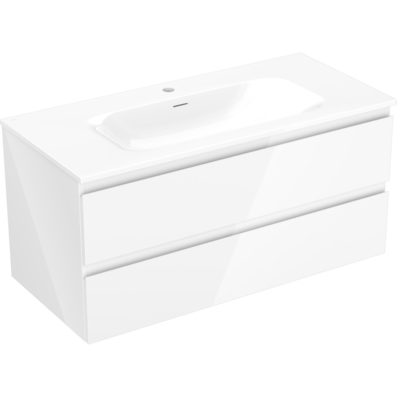 Specifikace produktu: Rozměry skříňky: Šířka: 100 cm Hloubka: 46 cm Výška: 47 cm Barva korpusu: Lesklá bílá Materiál korpusu: Lakovaná deska Barva čela: Lesklá bílá Materiál čela: Lakovaná MDF deska Struktura čela: Hladká Počet zásuvek: 2 Prostorná zásuvka s funkcí tichého dovírání Povrch odolný vůči UV záření Rozměry umyvadla: Šířka: 101 cm Hloubka: 46,5 cm Výška: 16,5 cm Barva umyvadla: Lesklá bílá Materiál umyvadla: Konglomerát Otvor pro přepad: Ano Otvor pro baterii: Ano Smontovaný výrobek