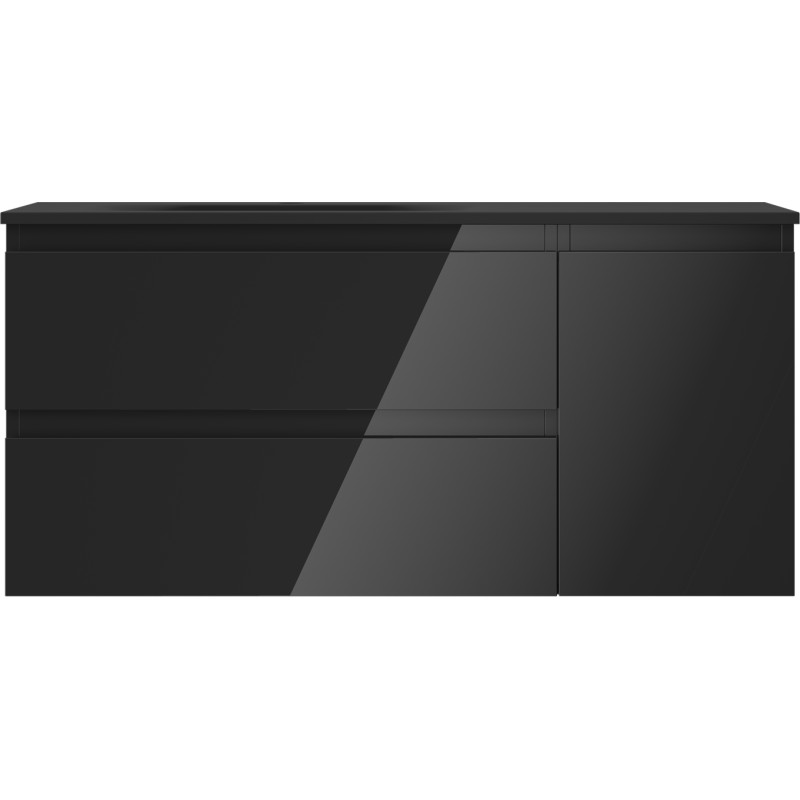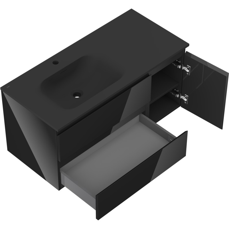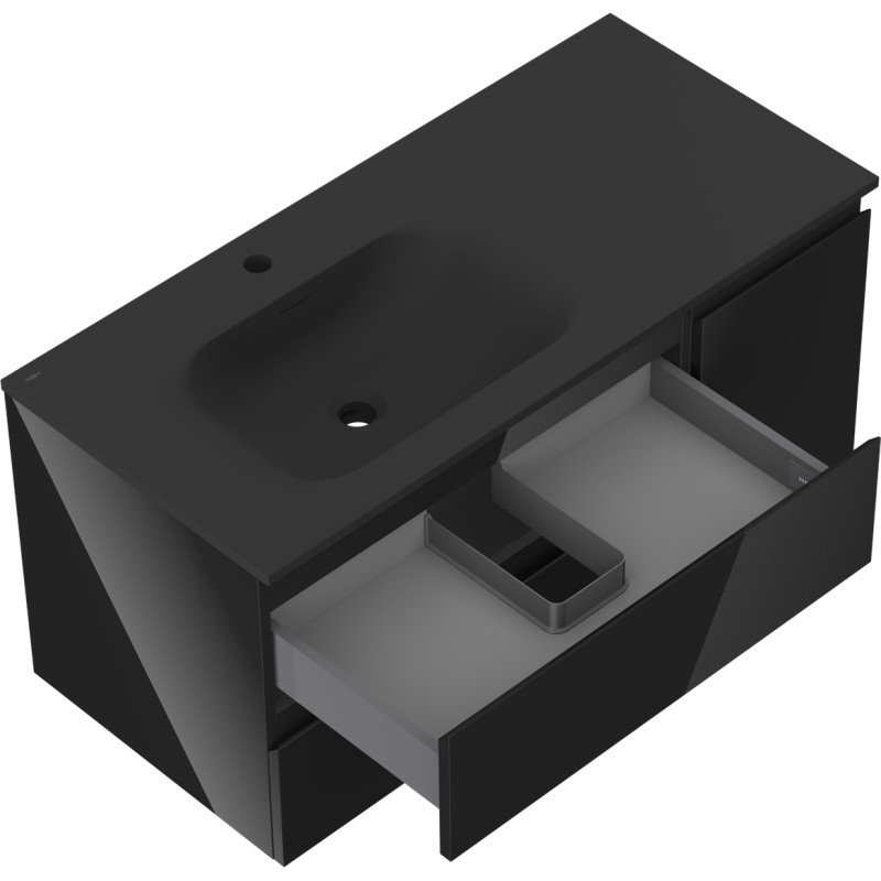 Specifikace produktu: Rozměry skříňky: Šířka: 100 cm Hloubka: 46 cm Výška: 47 cm Sada obsahuje: Zásuvková skříňka pod umyvadlo: Šířka: 70 cm Hloubka: 46 cm Výška: 47 cm Barva korpusu: Černý lesk Materiál korpusu: Lakovaná deska Barva čela: Černý lesk Materiál čela: Lakovaná MDF Struktura čela: Hladká Počet zásuvek: 2 Prostorná zásuvka s funkcí tlumeného dovírání Umyvadlová skříňka s dvířky: Šířka: 30 cm Výška: 47 cm Hloubka: 46 cm Barva korpusu: Černý lesk Materiál korpusu: Lakovaná deska Barva čela: Černý lesk Materiál čela: Lakovaná MDF Struktura čela: Hladká Počet dvířek: 1 1 police Panty s funkcí tlumeného dovírání Univerzální montáž dvířek (levé/pravé) UV odolný povrch Umyvadlo: Šířka: 101 cm Hloubka: 46,5 cm Výška: 16,5 cm Barva umyvadla: Matná černá Materiál umyvadla: Konglomerát Otvor pro přepad: Ano Otvor pro baterii: Ano Smontovaný výrobek