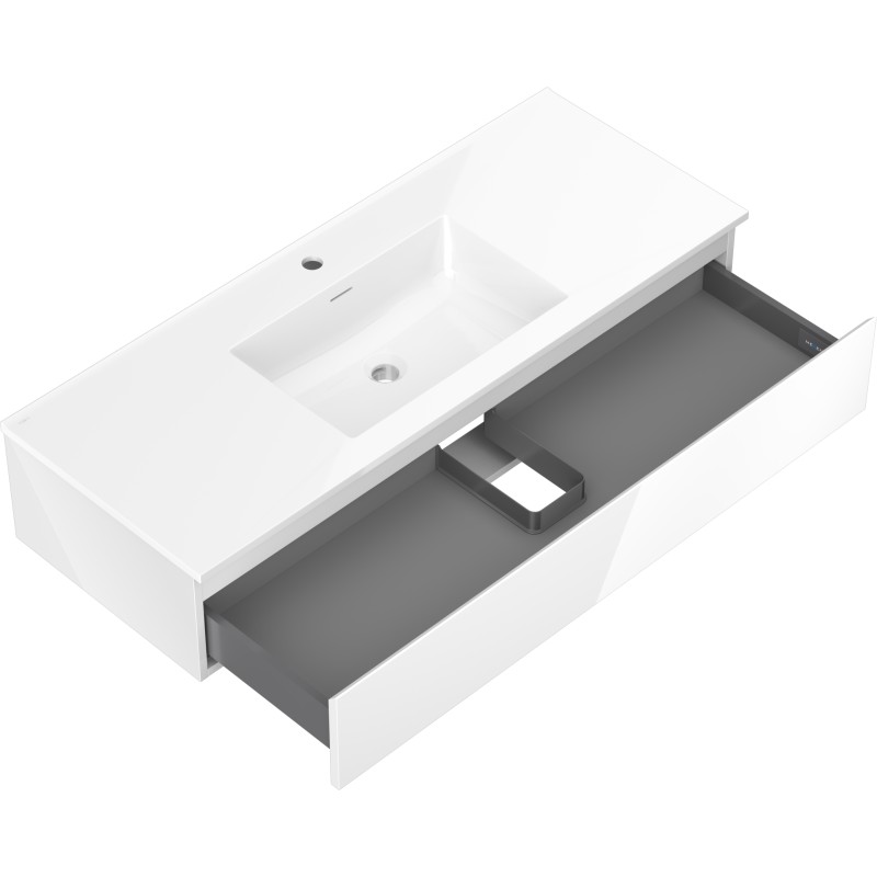 Specifikace produktu: Rozměry skříňky: Šířka: 120 cm Hloubka: 46 cm Výška: 23,5 cm Barva korpusu: Lesklá bílá Materiál korpusu: Lakovaná deska Barva čela: Lesklá bílá Materiál čela: Lakovaná MDF deska Struktura čela: Hladká Počet zásuvek: 1 Prostorná zásuvka s funkcí tichého dovírání Povrch odolný vůči UV záření Rozměry umyvadla: Šířka: 121 cm Hloubka: 46,5 cm Výška: 16,5 cm Barva umyvadla: Lesklá bílá Materiál umyvadla: Konglomerát Otvor pro přepad: Ano Otvor pro baterii: Ano Smontovaný výrobek