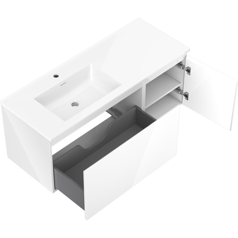 Specifikace produktu: Rozměry skříňky: Šířka: 120 cm Hloubka: 46 cm Výška: 47 cm Sada obsahuje: Zásuvková skříňka pod umyvadlo: Šířka: 80 cm Hloubka: 46 cm Výška: 47 cm Barva korpusu: Bílý lesk Materiál korpusu: Lakovaná deska Barva čela: Bílý lesk Materiál čela: Lakovaná MDF deska Konstrukce čela: Hladká Počet zásuvek: 1 Prostorná zásuvka s funkcí tlumeného dovírání Umyvadlová skříňka s dvířky: Šířka: 40 cm Výška: 47 cm Hloubka: 46 cm Barva korpusu: Bílý lesk Materiál korpusu: Lakovaná deska Barva čela: Bílý lesk Materiál čela: Lakovaná MDF deska Konstrukce čela: Hladká Počet dvířek: 1 1 police Panty s funkcí tlumeného dovírání Univerzální montáž dvířek (levé/pravé) UV odolný povrch Umyvadlo: Šířka: 121 cm Hloubka: 46,5 cm Výška: 16,5 cm Barva umyvadla: Lesklá bílá Materiál umyvadla: Konglomerát Otvor pro přepad: Ano Otvor pro baterii: Ano Smontovaný výrobek