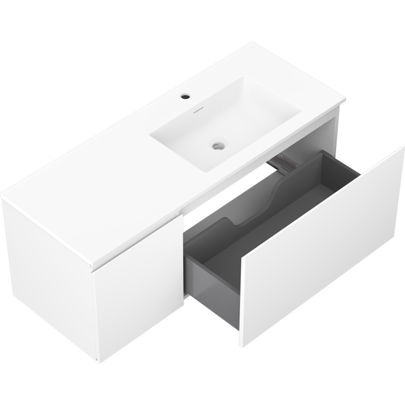 Specifikace produktu: Rozměry skříňky: Šířka: 120 cm Hloubka: 46 cm Výška: 47 cm Sada obsahuje: Zásuvková skříňka pod umyvadlo: Šířka: 80 cm Hloubka: 46 cm Výška: 47 cm Barva korpusu: Matná bílá Materiál korpusu: Lakovaná deska Barva čela: Matná bílá Materiál čela: Lakovaná MDF deska Struktura čela: Hladká Počet zásuvek: 1 Prostorná zásuvka s funkcí tlumeného dovírání Umyvadlová skříňka s dvířky: Šířka: 40 cm Výška: 47 cm Hloubka: 46 cm Barva korpusu: Matná bílá Materiál korpusu: Lakovaná deska Barva čela: Matná bílá Materiál čela: Lakovaná MDF deska Struktura čela: Hladká Počet dvířek: 1 1 police Panty s funkcí tlumeného dovírání Univerzální montáž dvířek (levé/pravé) Povrch odolný vůči UV záření Umyvadlo: Šířka: 121 cm Hloubka: 46,5 cm Výška: 16,5 cm Barva umyvadla: Matná bílá Materiál umyvadla: Konglomerát Otvor pro přepad: Ano Otvor pro baterii: Ano Produkt smontovaný