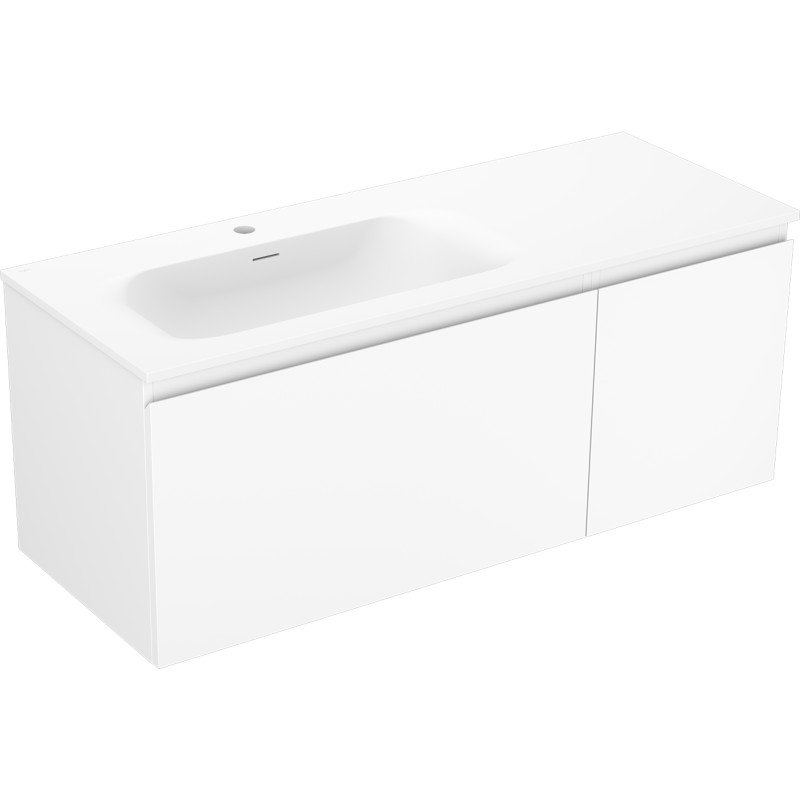 Specifikace produktu: Rozměry skříňky: Šířka: 120 cm Hloubka: 46 cm Výška: 47 cm Sada obsahuje: Zásuvková skříňka pod umyvadlo: Šířka: 80 cm Hloubka: 46 cm Výška: 47 cm Barva korpusu: Matná bílá Materiál korpusu: Lakovaná deska Barva čela: Matná bílá Materiál čela: Lakovaná MDF deska Struktura čela: Hladká Počet zásuvek: 1 Prostorná zásuvka s funkcí tlumeného dovírání Umyvadlová skříňka s dvířky: Šířka: 40 cm Výška: 47 cm Hloubka: 46 cm Barva korpusu: Matná bílá Materiál korpusu: Lakovaná deska Barva čela: Matná bílá Materiál čela: Lakovaná MDF deska Struktura čela: Hladká Počet dvířek: 1 1 police Panty s funkcí tlumeného dovírání Univerzální montáž dvířek (levé/pravé) Povrch odolný vůči UV záření Umyvadlo: Šířka: 121 cm Hloubka: 46,5 cm Výška: 16,5 cm Barva umyvadla: Matná bílá Materiál umyvadla: Konglomerát Otvor pro přepad: Ano Otvor pro baterii: Ano Produkt smontovaný