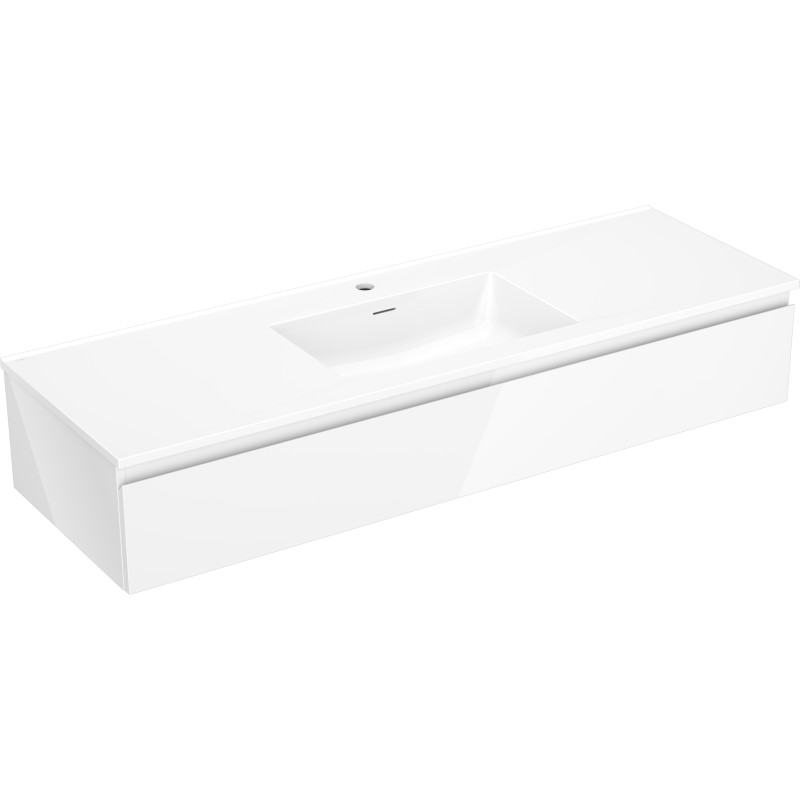 Specifikace produktu: Rozměry skříňky: Šířka: 140 cm Hloubka: 46 cm Výška: 23,5 cm Barva korpusu: Lesklá bílá Materiál korpusu: Lakovaná deska Barva čela: Lesklá bílá Materiál čela: Lakovaná MDF deska Struktura čela: Hladká Počet zásuvek: 1 Prostorná zásuvka s funkcí tichého dovírání Povrch odolný vůči UV záření Rozměry umyvadla: Šířka: 141 cm Hloubka: 46,5 cm Výška: 16,5 cm Barva umyvadla: Lesklá bílá Materiál umyvadla: Konglomerát Otvor pro přepad: Ano Otvor pro baterii: Ano Smontovaný výrobek
