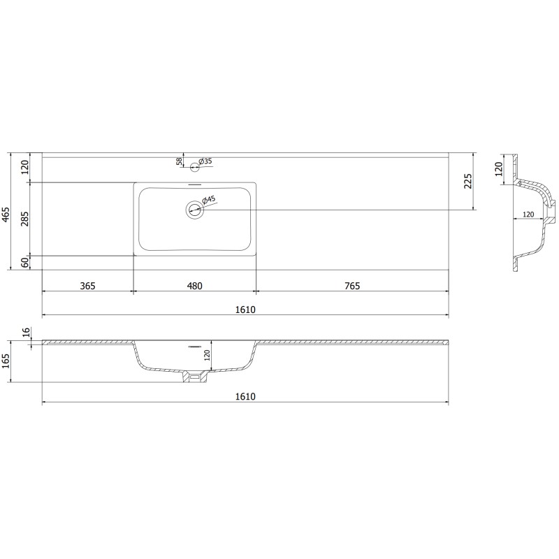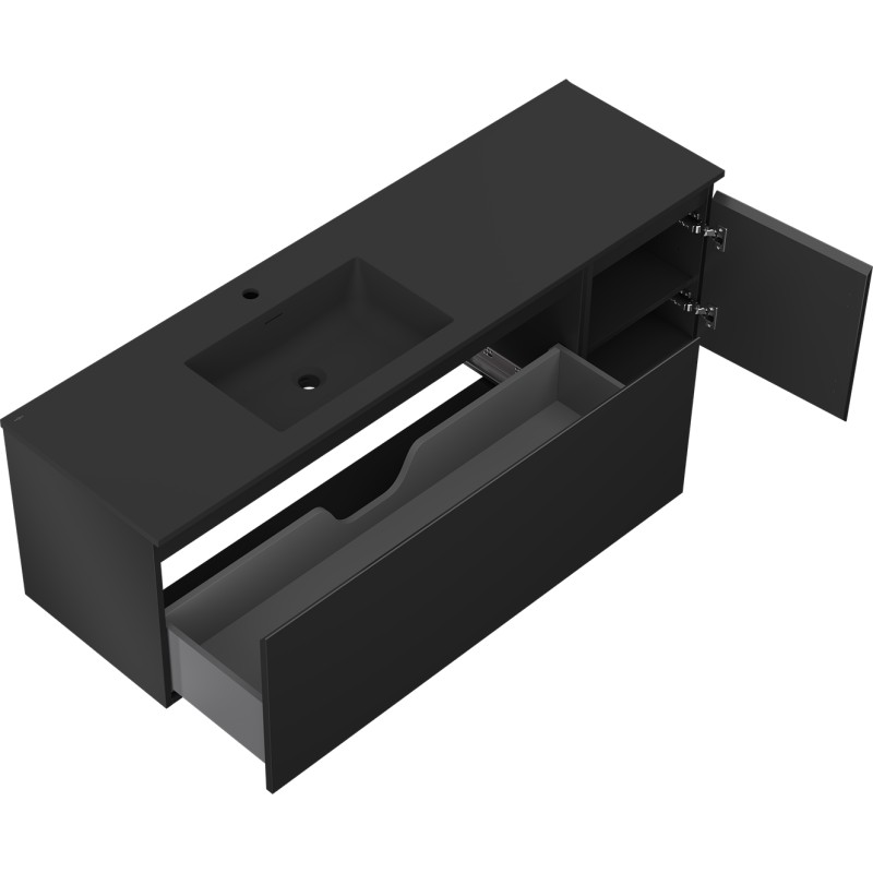 Specifikace produktu: Rozměry skříňky: Šířka: 160 cm Hloubka: 46 cm Výška: 47 cm Sada obsahuje: Zásuvková skříňka pod umyvadlo: Šířka: 120 cm Hloubka: 46 cm Výška: 47 cm Barva korpusu: Matná černá Materiál korpusu: Lakovaná deska Barva čela: Matná černá Materiál čela: Lakovaná MDF deska Struktura čela: Hladká Počet zásuvek: 1 Prostorná zásuvka s funkcí tlumeného dovírání Umyvadlová skříňka s dvířky: Šířka: 40 cm Výška: 47 cm Hloubka: 46 cm Barva korpusu: Matná černá Materiál korpusu: Lakovaná deska Barva čela: Matná černá Materiál čela: Lakovaná MDF deska Struktura čela: Hladká Počet dvířek: 1 1 police Panty s funkcí tlumeného dovírání Univerzální montáž dvířek (levé/pravé) UV odolný povrch Umyvadlo: Šířka: 161 cm Hloubka: 46,5 cm Výška: 16,5 cm Barva umyvadla: Matná černá Materiál umyvadla: Konglomerát Otvor pro přepad: Ano Otvor pro baterii: Ano Smontovaný výrobek