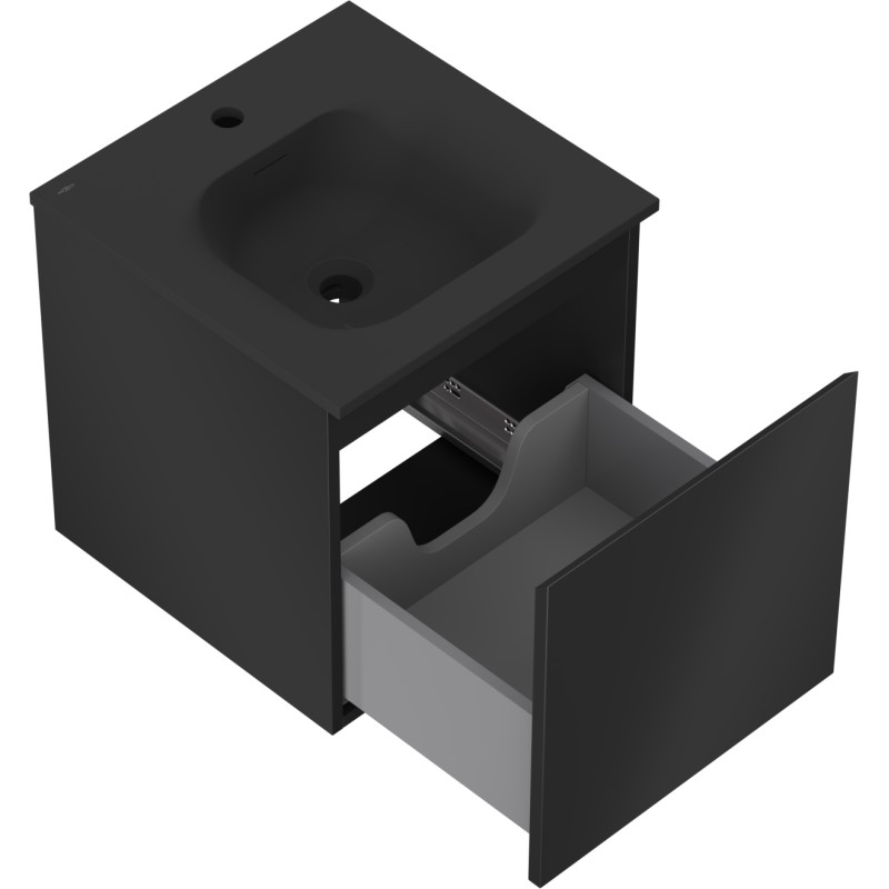 Specifikace produktu: Rozměry skříňky: Šířka: 45 cm Hloubka: 46 cm Výška: 47 cm Barva korpusu: Matná černá Materiál korpusu: Lakovaná deska Barva čela: Matná černá Materiál čela: Lakovaná MDF deska Struktura čela: Hladká Počet zásuvek: 1 Prostorná zásuvka s funkcí tichého dovírání Povrch odolný vůči UV záření Rozměry umyvadla: Šířka: 46 cm Hloubka: 46,5 cm Výška: 16,5 cm Barva umyvadla: Matná černá Materiál umyvadla: Konglomerát Otvor pro přepad: Ano Otvor pro baterii: Ano Smontovaný výrobek