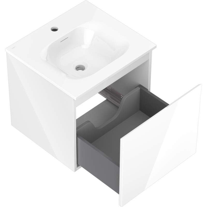 Specifikace produktu: Rozměry skříňky: Šířka: 50 cm Hloubka: 46 cm Výška: 47 cm Barva korpusu: Lesklá bílá Materiál korpusu: Lakovaná deska Barva čela: Lesklá bílá Materiál čela: Lakovaná MDF deska Struktura čela: Hladká Počet zásuvek: 1 Prostorná zásuvka s funkcí tlumeného dovírání Povrch odolný vůči UV záření Rozměry umyvadla: Šířka: 51 cm Hloubka: 46,5 cm Výška: 16,5 cm Barva umyvadla: Lesklá bílá Materiál umyvadla: Konglomerát Otvor pro přepad: Ano Otvor pro baterii: Ano Smontovaný výrobek