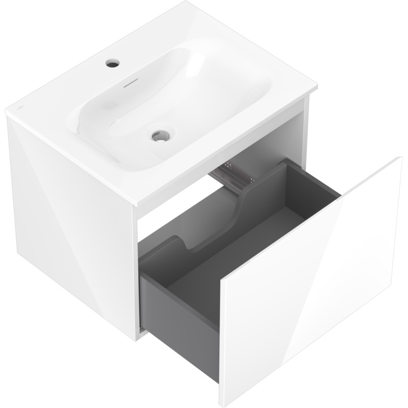 Specifikace produktu: Rozměry skříňky: Šířka: 60 cm Hloubka: 46 cm Výška: 47 cm Barva korpusu: Lesklá bílá Materiál korpusu: Lakovaná deska Barva čela: Lesklá bílá Materiál čela: Lakovaná MDF deska Struktura čela: Hladká Počet zásuvek: 1 Prostorná zásuvka s funkcí tlumeného dovírání Povrch odolný vůči UV záření Rozměry umyvadla: Šířka: 61 cm Hloubka: 46,5 cm Výška: 16,5 cm Barva umyvadla: Lesklá bílá Materiál umyvadla: Konglomerát Otvor pro přepad: Ano Otvor pro baterii: Ano Smontovaný výrobek
