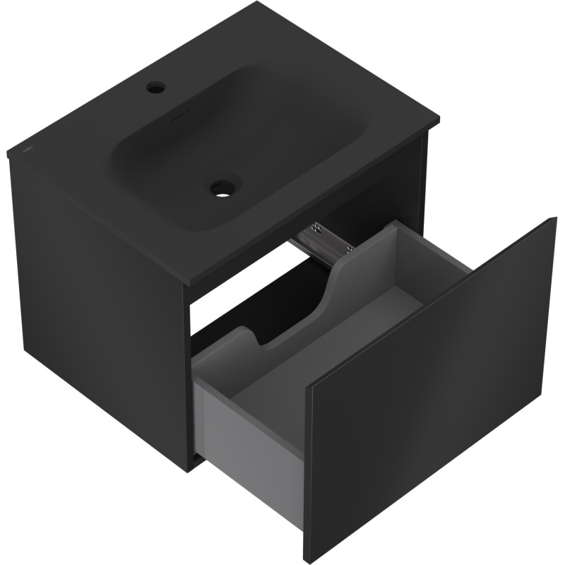 Specifikace produktu: Rozměry skříňky: Šířka: 60 cm Hloubka: 46 cm Výška: 47 cm Barva korpusu: Matná černá Materiál korpusu: Lakovaná deska Barva čela: Matná černá Materiál čela: Lakovaná MDF deska Struktura čela: Hladká Počet zásuvek: 1 Prostorná zásuvka s funkcí tlumeného dovírání Povrch odolný vůči UV záření Rozměry umyvadla: Šířka: 61 cm Hloubka: 46,5 cm Výška: 16,5 cm Barva umyvadla: Matná černá Materiál umyvadla: Konglomerát Otvor pro přepad: Ano Otvor pro baterii: Ano Smontovaný výrobek