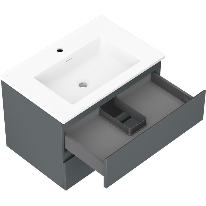 Specifikace produktu: Rozměry skříňky: Šířka: 70 cm Hloubka: 46 cm Výška: 47 cm Barva korpusu: Matný grafit Materiál korpusu: Lakovaná deska Barva čela: Matný grafit Materiál čela: Lakovaná MDF deska Struktura čela: Hladká Počet zásuvek: 2 Prostorná zásuvka s funkcí tlumeného dovírání Povrch odolný vůči UV záření Rozměry umyvadla: Šířka: 71 cm Hloubka: 46,5 cm Výška: 16,5 cm Barva umyvadla: Matná bílá Materiál umyvadla: Konglomerát Otvor pro přepad: Ano Otvor pro baterii: Ano Smontovaný výrobek