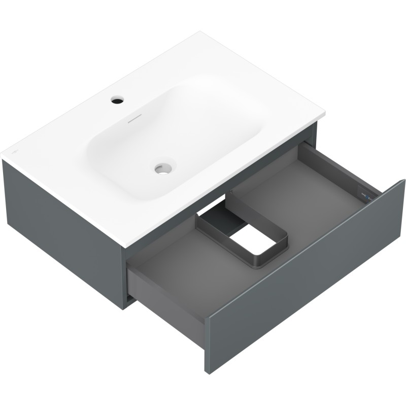 Specifikace produktu: Rozměry skříňky: Šířka: 70 cm Hloubka: 46 cm Výška: 23,5 cm Barva korpusu: Matný grafit Materiál korpusu: Lakovaná deska Barva čela: Matný grafit Materiál čela: Lakovaná MDF deska Struktura čela: Hladká Počet zásuvek: 1 Prostorná zásuvka s funkcí tlumeného dovírání Povrch odolný vůči UV záření Rozměry umyvadla: Šířka: 71 cm Hloubka: 46,5 cm Výška: 16,5 cm Barva umyvadla: Matná bílá Materiál umyvadla: Konglomerát Otvor pro přepad: Ano Otvor pro baterii: Ano Smontovaný výrobek