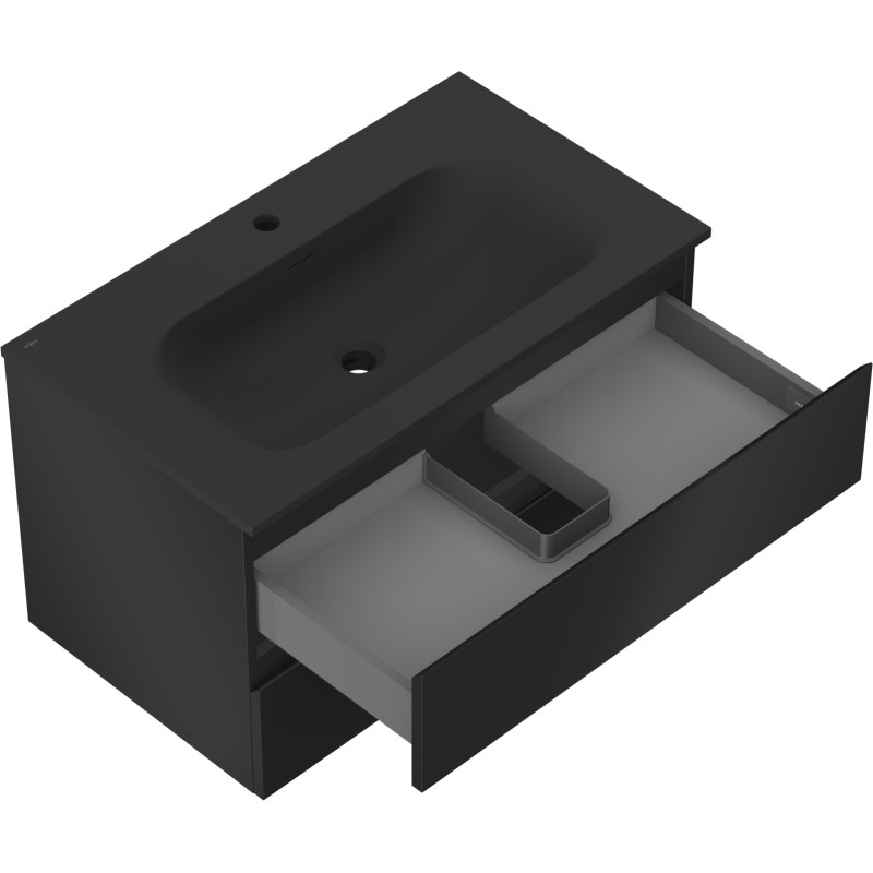 Specifikace produktu: Rozměry skříňky: Šířka: 80 cm Hloubka: 46 cm Výška: 47 cm Barva korpusu: Matná černá Materiál korpusu: Lakovaná deska Barva čela: Matná černá Materiál čela: Lakovaná MDF deska Struktura čela: Hladká Počet zásuvek: 2 Prostorná zásuvka s funkcí tlumeného dovírání Povrch odolný vůči UV záření Rozměry umyvadla: Šířka: 81 cm Hloubka: 46,5 cm Výška: 16,5 cm Barva umyvadla: Matná černá Materiál umyvadla: Konglomerát Otvor pro přepad: Ano Otvor pro baterii: Ano Smontovaný výrobek