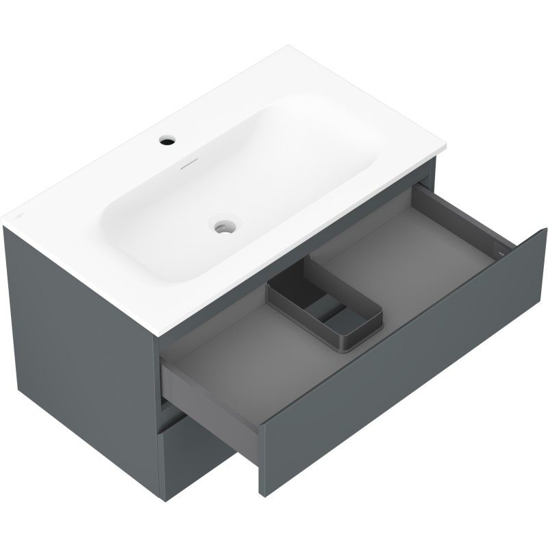 Specifikace produktu: Rozměry skříňky: Šířka: 80 cm Hloubka: 46 cm Výška: 47 cm Barva korpusu: Matný grafit Materiál korpusu: Lakovaná deska Barva čela: Matný grafit Materiál čela: Lakovaná MDF deska Struktura čela: Hladká Počet zásuvek: 2 Prostorná zásuvka s funkcí tlumeného dovírání Povrch odolný vůči UV záření Rozměry umyvadla: Šířka: 81 cm Hloubka: 46,5 cm Výška: 16,5 cm Barva umyvadla: Matná bílá Materiál umyvadla: Konglomerát Otvor pro přepad: Ano Otvor pro baterii: Ano Smontovaný výrobek
