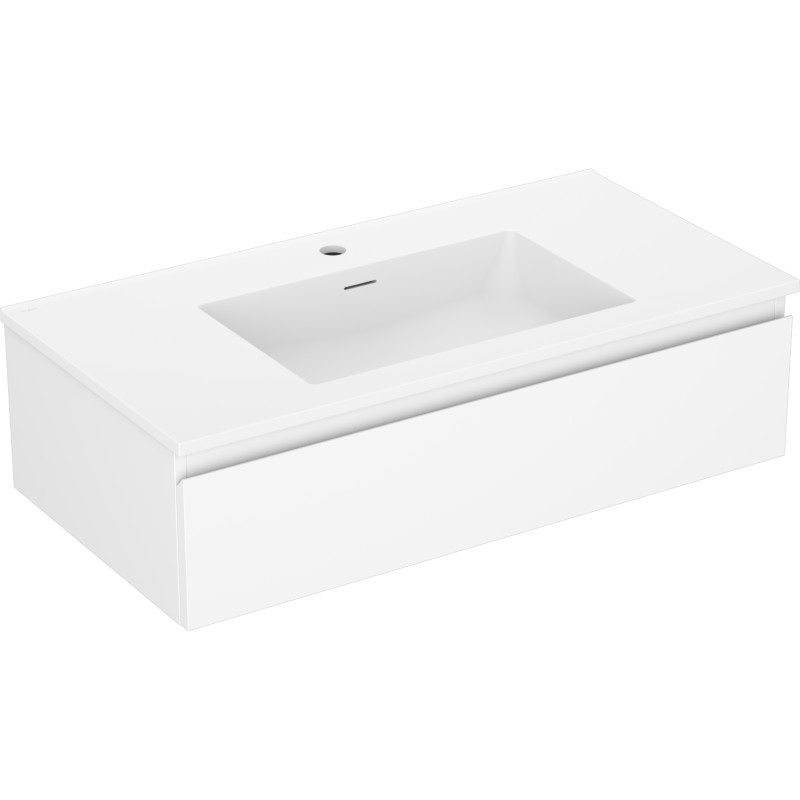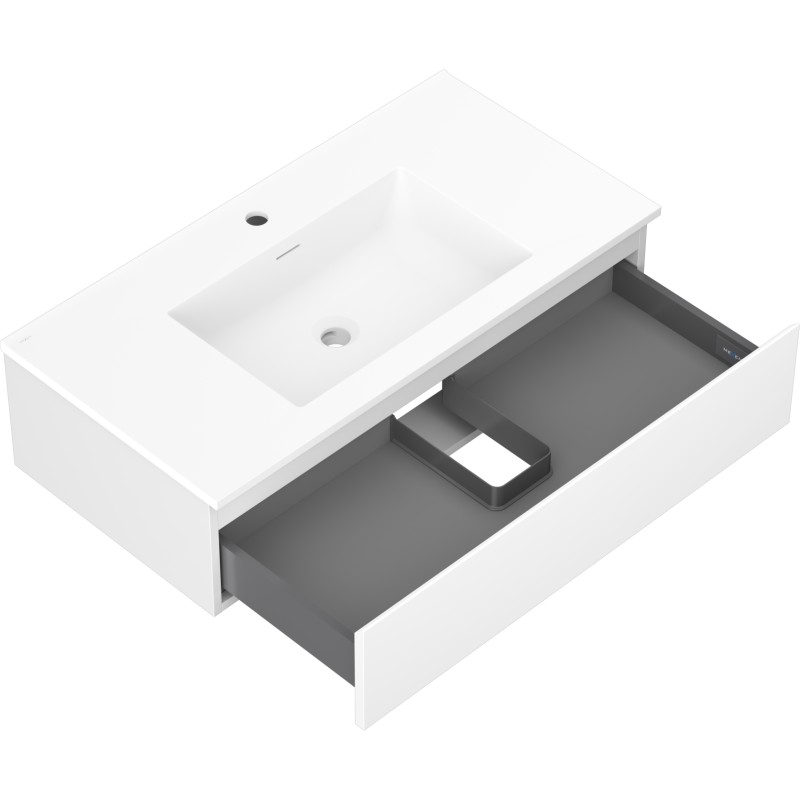 Specifikace produktu: Rozměry skříňky: Šířka: 90 cm Hloubka: 46 cm Výška: 23,5 cm Barva korpusu: Matná bílá Materiál korpusu: Lakovaná deska Barva čela: Matná bílá Materiál čela: Lakovaná MDF deska Struktura čela: Hladká Počet zásuvek: 1 Prostorná zásuvka s funkcí tlumeného dovírání Povrch odolný vůči UV záření Rozměry umyvadla: Šířka: 91 cm Hloubka: 46,5 cm Výška: 16,5 cm Barva umyvadla: Matná bílá Materiál umyvadla: Konglomerát Otvor pro přepad: Ano Otvor pro baterii: Ano Smontovaný výrobek
