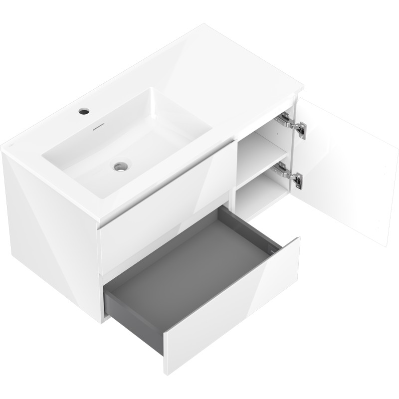Specifikace produktu: Rozměry skříňky: Šířka: 90 cm Hloubka: 46 cm Výška: 47 cm Sada obsahuje: Zásuvková skříňka pod umyvadlo: Šířka: 60 cm Hloubka: 46 cm Výška: 47 cm Barva korpusu: Bílý lesk Materiál korpusu: Lakovaná deska Barva čela: Bílý lesk Materiál čela: Lakovaná MDF deska Struktura čela: Hladká Počet zásuvek: 2 Prostorná zásuvka s funkcí tlumeného dovírání Povrch odolný proti UV záření Skříňka pod umyvadlo s dvířky: Šířka: 30 cm Výška: 47 cm Hloubka: 46 cm Barva korpusu: Bílý lesk Materiál korpusu: Lakovaná deska Barva čela: Bílý lesk Materiál čela: Lakovaná MDF deska Struktura čela: Hladká Počet dvířek: 1 1 police Panty s funkcí tlumeného dovírání Univerzální montáž dvířek (levé/pravé) Povrch odolný proti UV záření Umyvadlo: Šířka: 91 cm Hloubka: 46,5 cm Výška: 16,5 cm Barva umyvadla: Lesklá bílá Materiál umyvadla: Konglomerát Otvor pro přepad: Ano Otvor pro baterii: Ano Smontovaný produkt