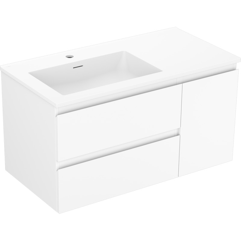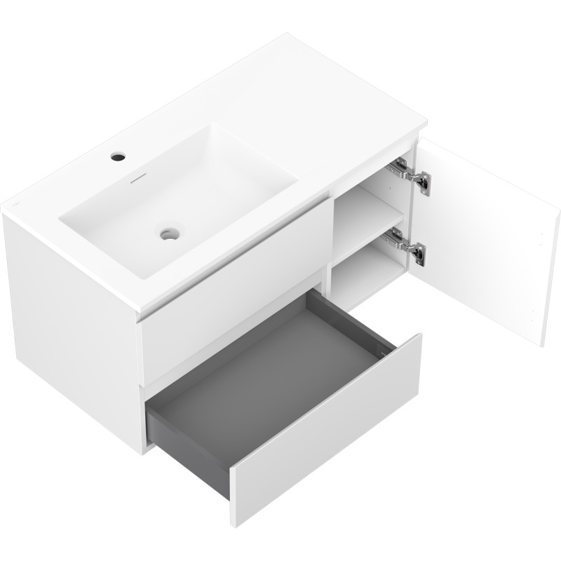 Specifikace produktu: Rozměry skříňky: Šířka: 90 cm Hloubka: 46 cm Výška: 47 cm Sada obsahuje: Zásuvková skříňka pod umyvadlo: Šířka: 60 cm Hloubka: 46 cm Výška: 47 cm Barva korpusu: Matná bílá Materiál korpusu: Lakovaná deska Barva čela: Matná bílá Materiál čela: Lakovaná MDF deska Struktura čela: Hladká Počet zásuvek: 2 Prostorná zásuvka s funkcí tlumeného dovírání Umyvadlová skříňka s dvířky: Šířka: 30 cm Výška: 47 cm Hloubka: 46 cm Barva korpusu: Matná bílá Materiál korpusu: Lakovaná deska Barva čela: Matná bílá Materiál čela: Lakovaná MDF deska Struktura čela: Hladká Počet dvířek: 1 1 police Panty s funkcí tlumeného dovírání Univerzální montáž dvířek (levé/pravé) UV odolný povrch Umyvadlo: Šířka: 91 cm Hloubka: 46,5 cm Výška: 16,5 cm Barva umyvadla: Matná bílá Materiál umyvadla: Konglomerát Otvor pro přepad: Ano Otvor pro baterii: Ano Produkt smontovaný