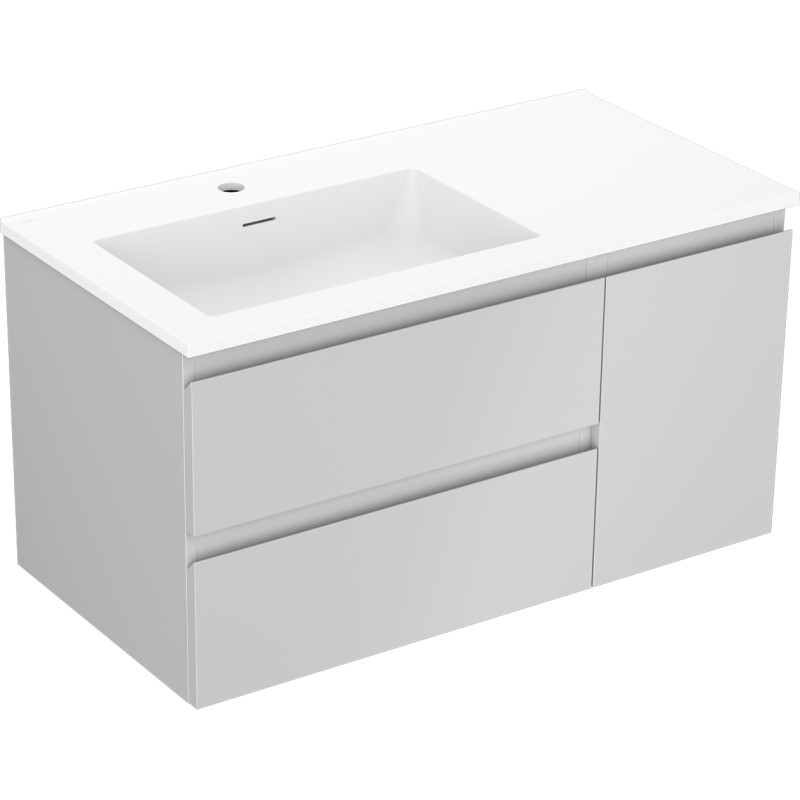 Specifikace produktu: Rozměry skříňky: Šířka: 90 cm Hloubka: 46 cm Výška: 47 cm Sada obsahuje: Zásuvková skříňka pod umyvadlo: Šířka: 60 cm Hloubka: 46 cm Výška: 47 cm Barva korpusu: Matně šedá Materiál korpusu: Lakovaná deska Barva čela: Matně šedá Materiál čela: Lakovaná MDF deska Struktura čela: Hladká Počet zásuvek: 2 Prostorná zásuvka s funkcí tlumeného dovírání Umyvadlová skříňka s dvířky: Šířka: 30 cm Výška: 47 cm Hloubka: 46 cm Barva korpusu: Matně šedá Materiál korpusu: Lakovaná deska Barva čela: Matně šedá Materiál čela: Lakovaná MDF deska Struktura čela: Hladká Počet dvířek: 1 1 police Panty s funkcí tlumeného dovírání Univerzální montáž dvířek (levé/pravé) UV odolný povrch Umyvadlo: Šířka: 91 cm Hloubka: 46,5 cm Výška: 16,5 cm Barva umyvadla: Matně bílá Materiál umyvadla: Konglomerát Otvor pro přepad: Ano Otvor pro baterii: Ano Smontovaný výrobek