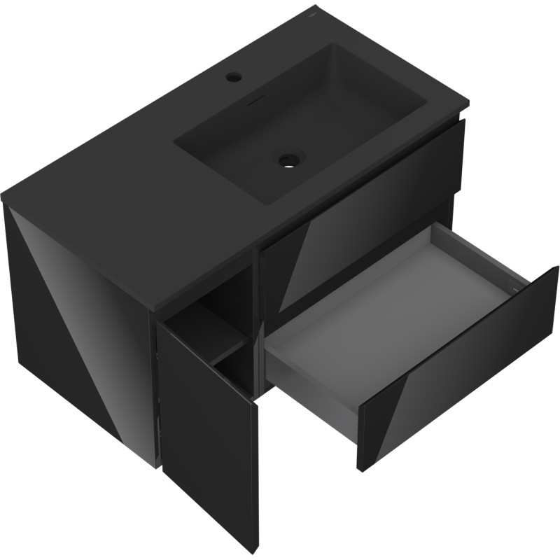 Specifikace produktu: Rozměry skříňky: Šířka: 90 cm Hloubka: 46 cm Výška: 47 cm Sada obsahuje: Zásuvková skříňka pod umyvadlo: Šířka: 60 cm Hloubka: 46 cm Výška: 47 cm Barva korpusu: Černý lesk Materiál korpusu: Lakovaná deska Barva čela: Černý lesk Materiál čela: Lakovaná MDF Struktura čela: Hladká Počet zásuvek: 2 Prostorná zásuvka s funkcí tlumeného dovírání Umyvadlová skříňka s dvířky: Šířka: 30 cm Výška: 47 cm Hloubka: 46 cm Barva korpusu: Černý lesk Materiál korpusu: Lakovaná deska Barva čela: Černý lesk Materiál čela: Lakovaná MDF Struktura čela: Hladká Počet dvířek: 1 1 police Panty s funkcí tlumeného dovírání Univerzální montáž dvířek (levé/pravé) UV odolný povrch Umyvadlo: Šířka: 91 cm Hloubka: 46,5 cm Výška: 16,5 cm Barva umyvadla: Matná černá Materiál umyvadla: Konglomerát Otvor pro přepad: Ano Otvor pro baterii: Ano Výrobek smontovaný