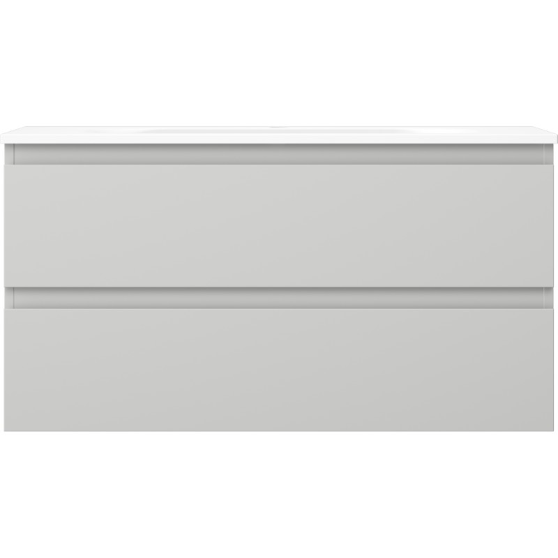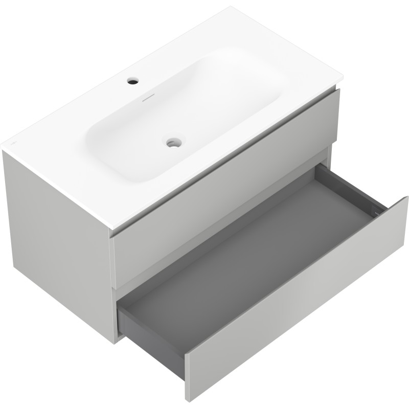 Specifikace produktu: Rozměry skříňky: Šířka: 90 cm Hloubka: 46 cm Výška: 47 cm Barva korpusu: Matně šedá Materiál korpusu: Lakovaná deska Barva čela: Matně šedá Materiál čela: Lakovaná MDF deska Struktura čela: Hladká Počet zásuvek: 2 Prostorná zásuvka s funkcí tlumeného dovírání Povrch odolný vůči UV záření Rozměry umyvadla: Šířka: 91 cm Hloubka: 46,5 cm Výška: 16,5 cm Barva umyvadla: Matně bílá Materiál umyvadla: Konglomerát Otvor pro přepad: Ano Otvor pro baterii: Ano Smontovaný výrobek