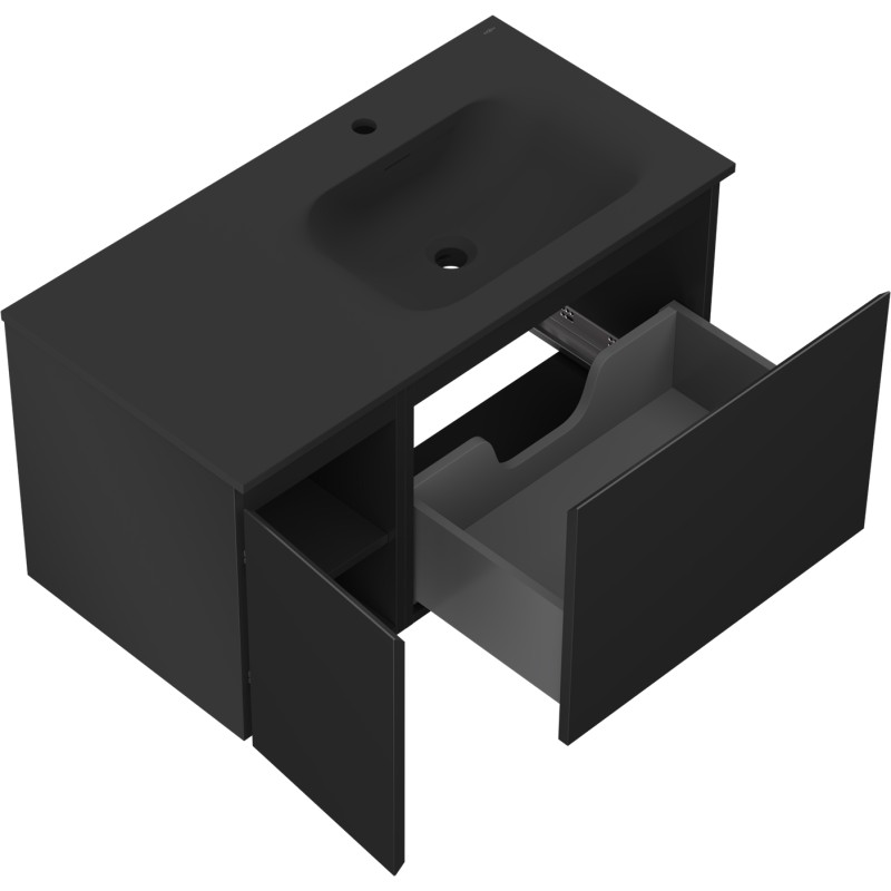 Specifikace produktu: Rozměry skříňky: Šířka: 90 cm Hloubka: 46 cm Výška: 47 cm Sada obsahuje: Zásuvková skříňka pod umyvadlo: Šířka: 60 cm Hloubka: 46 cm Výška: 47 cm Barva korpusu: Matná černá Materiál korpusu: Lakovaná deska Barva čela: Matná černá Materiál čela: Lakovaná MDF deska Struktura čela: Hladká Počet zásuvek: 1 Prostorná zásuvka s funkcí tlumeného dovírání Umyvadlová skříňka s dvířky: Šířka: 30 cm Výška: 47 cm Hloubka: 46 cm Barva korpusu: Matná černá Materiál korpusu: Lakovaná deska Barva čela: Matná černá Materiál čela: Lakovaná MDF deska Struktura čela: Hladká Počet dvířek: 1 1 police Panty s funkcí tlumeného dovírání Univerzální montáž dvířek (levé/pravé) UV odolný povrch Umyvadlo: Šířka: 91 cm Hloubka: 46,5 cm Výška: 16,5 cm Barva umyvadla: Matná černá Materiál umyvadla: Konglomerát Otvor pro přepad: Ano Otvor pro baterii: Ano Smontovaný výrobek