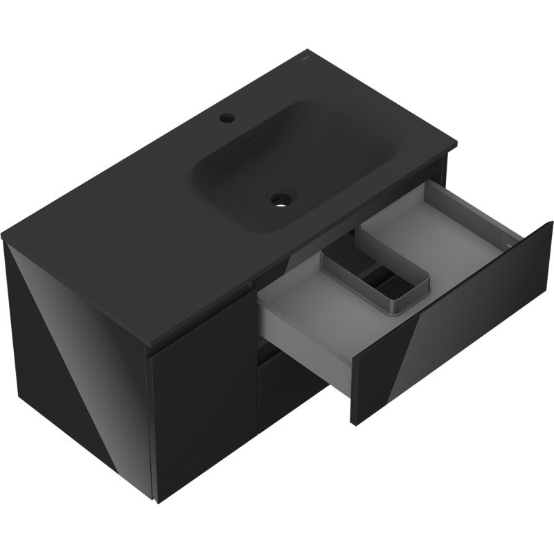 Specifikace produktu: Rozměry skříňky: Šířka: 90 cm Hloubka: 46 cm Výška: 47 cm Sada obsahuje: Zásuvková skříňka pod umyvadlo: Šířka: 60 cm Hloubka: 46 cm Výška: 47 cm Barva korpusu: Černý lesk Materiál korpusu: Lakovaná deska Barva čela: Černý lesk Materiál čela: Lakovaná MDF Struktura čela: Hladká Počet zásuvek: 2 Prostorná zásuvka s funkcí tlumeného dovírání Umyvadlová skříňka s dvířky: Šířka: 30 cm Výška: 47 cm Hloubka: 46 cm Barva korpusu: Černý lesk Materiál korpusu: Lakovaná deska Barva čela: Černý lesk Materiál čela: Lakovaná MDF Struktura čela: Hladká Počet dvířek: 1 1 police Panty s funkcí tlumeného dovírání Univerzální montáž dvířek (levé/pravé) UV odolný povrch Umyvadlo: Šířka: 91 cm Hloubka: 46,5 cm Výška: 16,5 cm Barva umyvadla: Matná černá Materiál umyvadla: Konglomerát Otvor pro přepad: Ano Otvor pro baterii: Ano Výrobek smontovaný