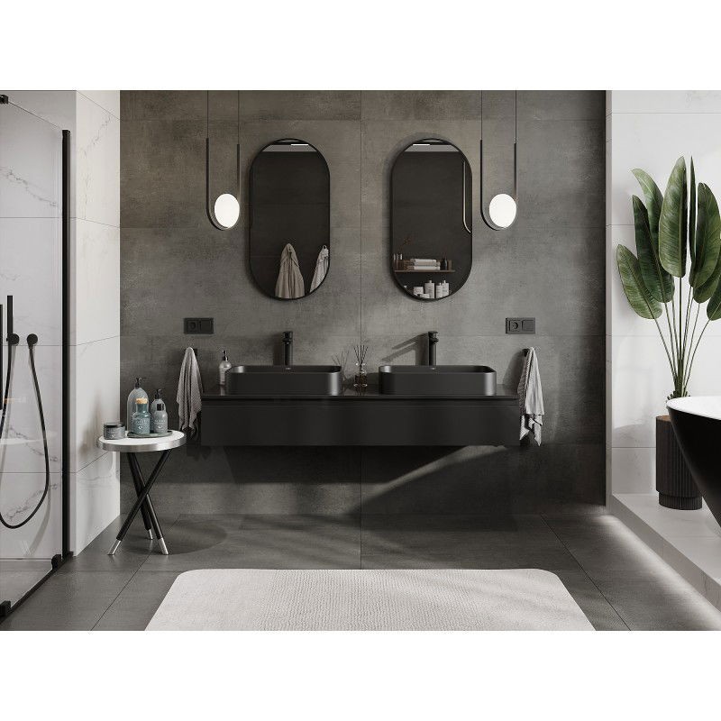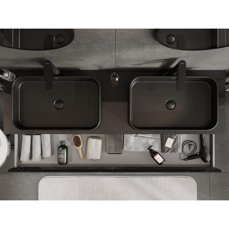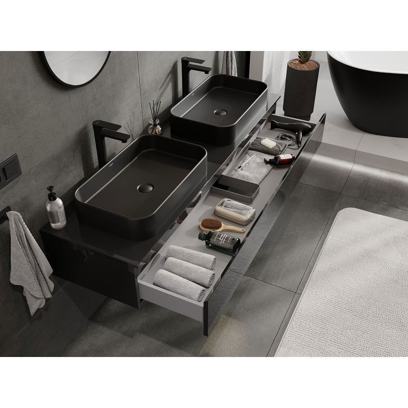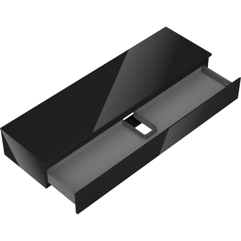 Specifikace produktu: Rozměry skříňky: Šířka: 160 cm Výška: 23,5 cm Hloubka: 46 cm Barva korpusu: Lesklá černá Materiál korpusu: Lakovaná deska Barva čela: Lesklá černá Materiál čela: Lakovaná MDF deska Struktura čela: Hladká Počet zásuvek: 1 Prostorná zásuvka s funkcí tichého dovírání Plný výsuv pro snadný přístup k obsahu zásuvky Povrch odolný vůči UV záření Rozměry pracovní desky: Šířka: 160,6 cm Hloubka: 46,5 cm Tloušťka: 1,8 cm Barva pracovní desky: Lesklá černá Materiál pracovní desky: Lakovaná MDF deska Povrch odolný vůči UV záření Ideální jako podstavec pro umyvadla na desku Sestavený produkt