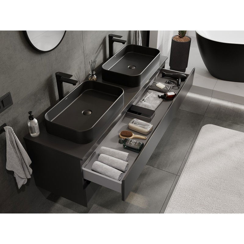 Specifikace produktu: Rozměry skříňky: Šířka: 160 cm Výška: 47 cm Hloubka: 46 cm Barva korpusu: Matná černá Materiál korpusu: Lakovaná deska Barva čela: Matná černá Materiál čela: Lakovaná MDF deska Struktura čela: Hladká Počet zásuvek: 2 Prostorná zásuvka s funkcí tlumeného dovírání Plný výsuv pro snadný přístup k obsahu zásuvky Povrch odolný vůči UV záření Rozměry pracovní desky: Šířka: 160,6 cm Hloubka: 46,5 cm Tloušťka: 1,8 cm Barva pracovní desky: Matná černá Materiál pracovní desky: Lakovaná MDF deska Povrch odolný vůči UV záření Ideální jako podstavec pro umyvadla na desku Sestavený produkt
