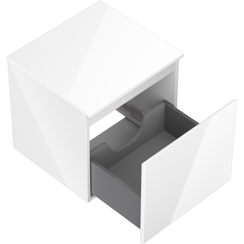 Specifikace produktu: Rozměry skříňky: Šířka: 50 cm Výška: 47 cm Hloubka: 46 cm Barva korpusu: Lesklá bílá Materiál korpusu: Lakovaná deska Barva čela: Lesklá bílá Materiál čela: Lakovaná MDF deska Struktura čela: Hladká Počet zásuvek: 1 Prostorná zásuvka s funkcí tlumeného dovírání Plný výsuv pro snadný přístup k obsahu zásuvky Povrch odolný vůči UV záření Rozměry pracovní desky: Šířka: 50,6 cm Hloubka: 46,5 cm Tloušťka: 1,8 cm Barva pracovní desky: Lesklá bílá Materiál pracovní desky: Lakovaná MDF deska Povrch odolný vůči UV záření Ideální jako podstavec pro umyvadla na desku Sestavený produkt