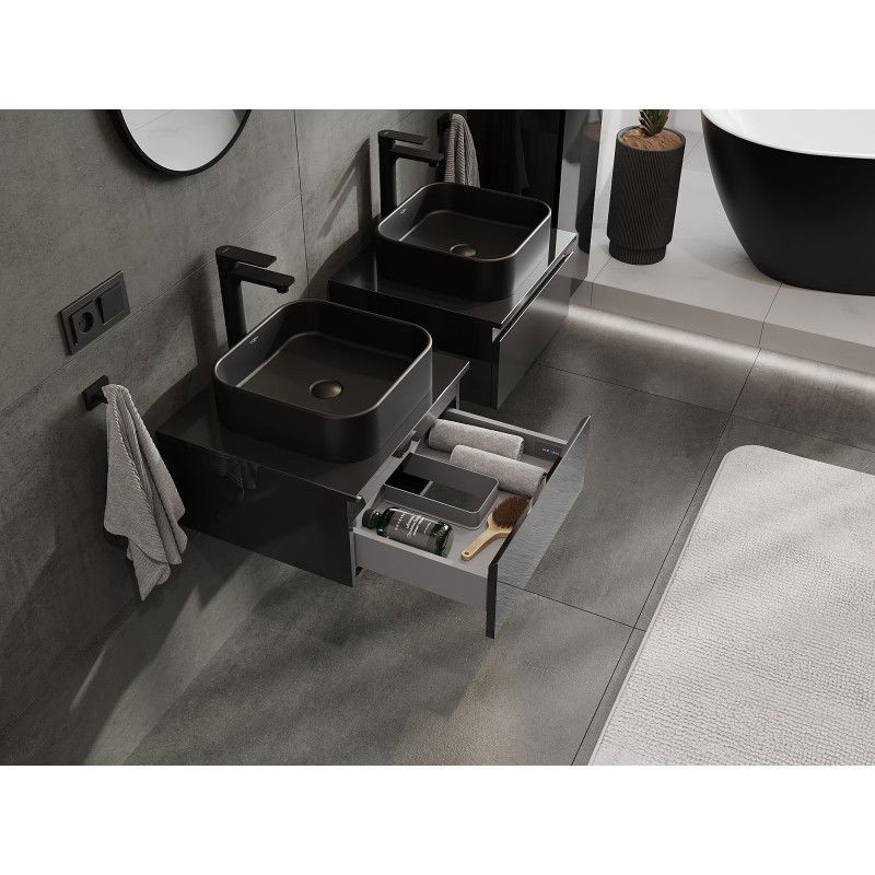 Specifikace produktu: Rozměry skříňky: Šířka: 50 cm Výška: 23,5 cm Hloubka: 46 cm Barva korpusu: Černá lesklá Materiál korpusu: Lakovaná deska Barva čela: Černá lesklá Materiál čela: Lakovaná MDF deska Struktura čela: Hladká Počet zásuvek: 1 Prostorná zásuvka s funkcí tichého dovírání Plný výsuv pro snadný přístup k obsahu zásuvky Povrch odolný vůči UV záření Rozměry pracovní desky: Šířka: 50,6 cm Hloubka: 46,5 cm Tloušťka: 1,8 cm Barva pracovní desky: Černá lesklá Materiál pracovní desky: Lakovaná MDF deska Povrch odolný vůči UV záření Ideální jako podstavec pro umyvadla na desku Sestavený produkt