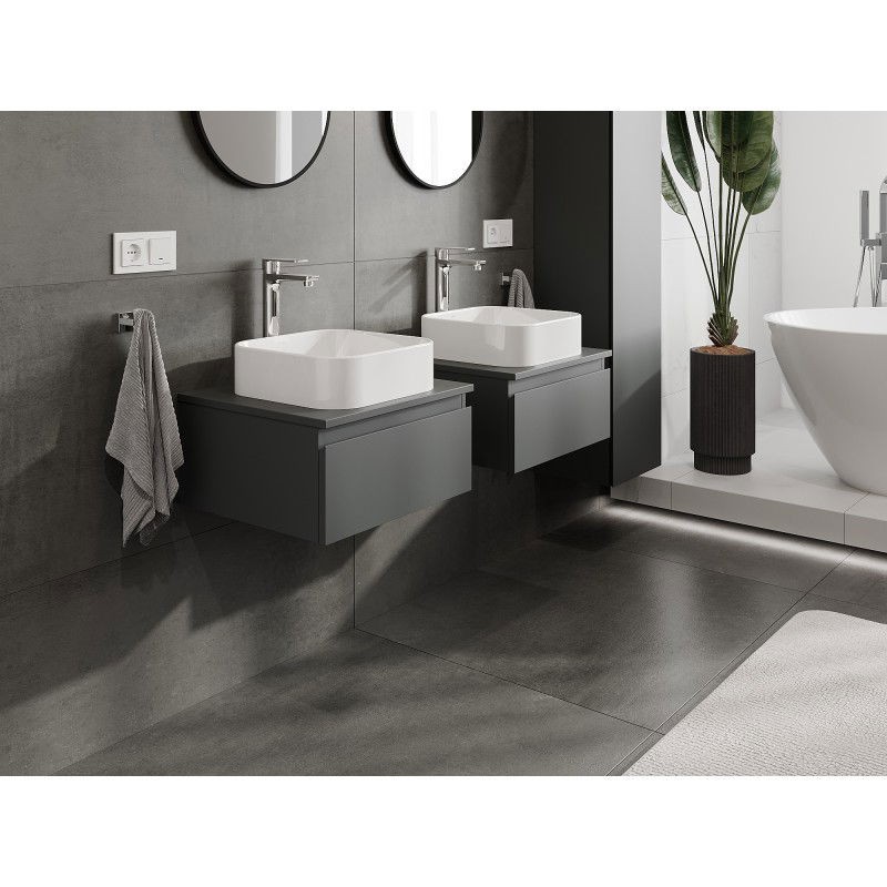 Specifikace produktu: Rozměry skříňky: Šířka: 50 cm Výška: 23,5 cm Hloubka: 46 cm Barva korpusu: Matný grafit Materiál korpusu: Lakovaná deska Barva čela: Matný grafit Materiál čela: Lakovaná MDF deska Struktura čela: Hladká Počet zásuvek: 1 Prostorná zásuvka s funkcí tlumeného dovírání Plný výsuv pro snadný přístup k obsahu zásuvky Povrch odolný vůči UV záření Rozměry pracovní desky: Šířka: 50,6 cm Hloubka: 46,5 cm Tloušťka: 1,8 cm Barva pracovní desky: Matný grafit Materiál pracovní desky: Lakovaná MDF deska Povrch odolný vůči UV záření Ideální jako podstavec pro umyvadla na desku Sestavený produkt