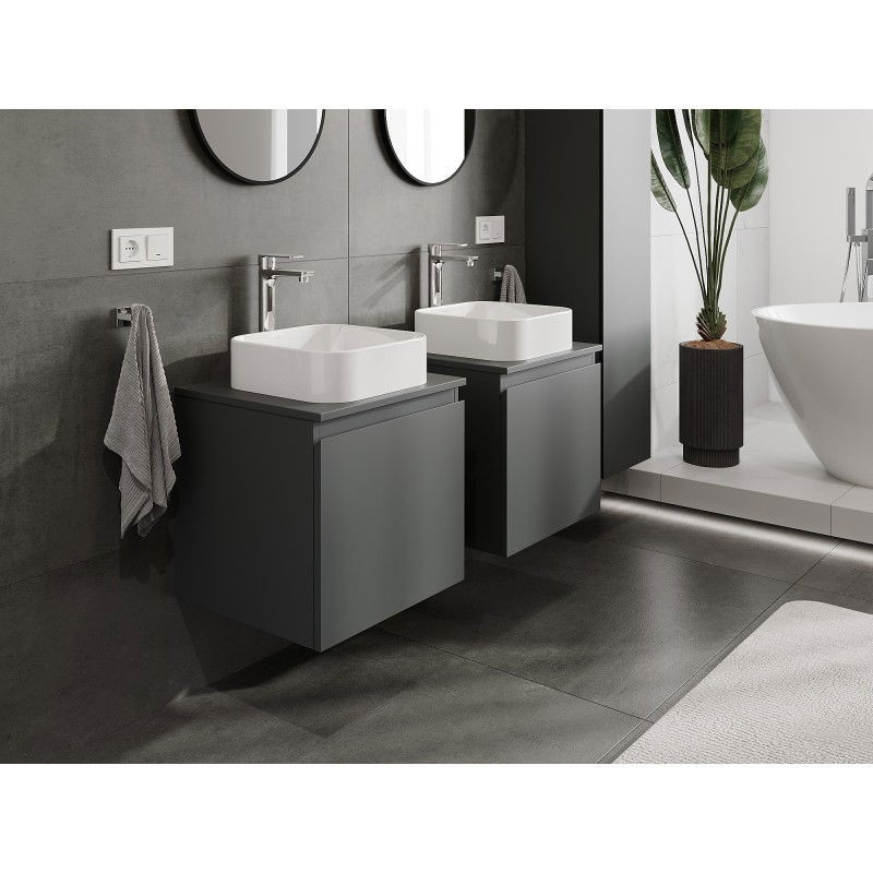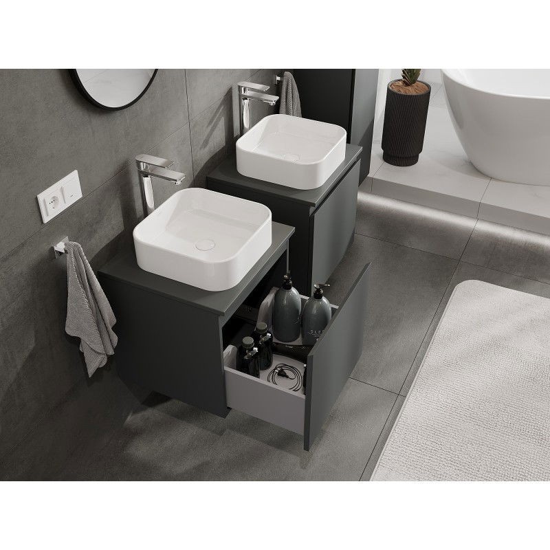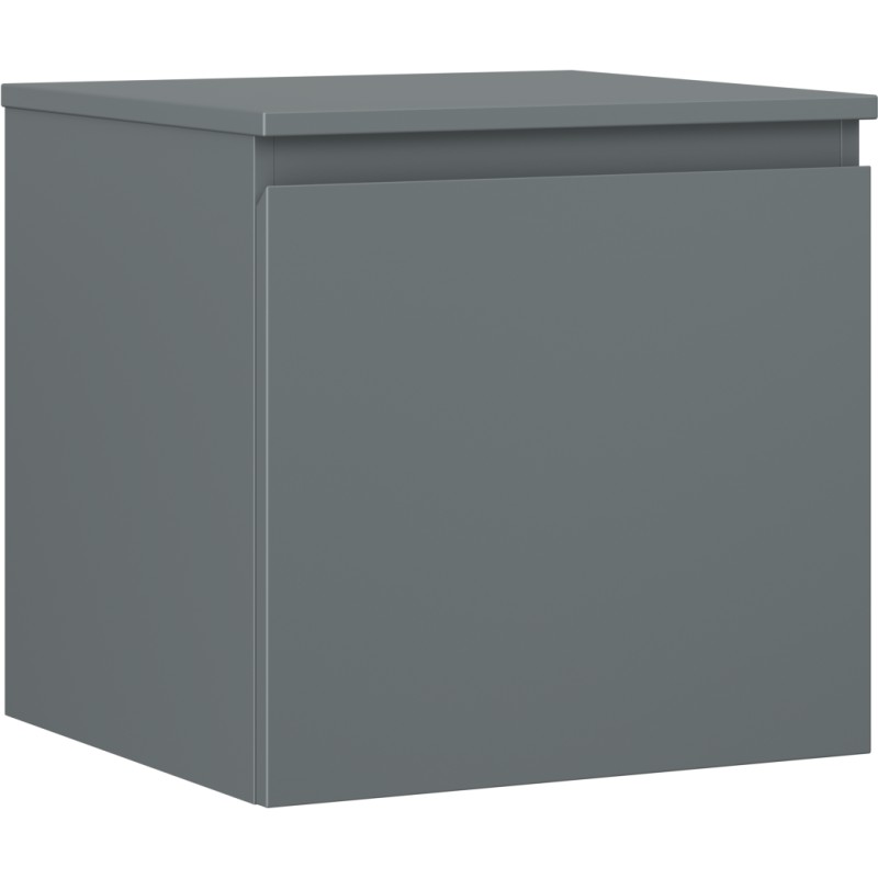 Specifikace produktu: Rozměry skříňky: Šířka: 50 cm Výška: 47 cm Hloubka: 46 cm Barva korpusu: Matný grafit Materiál korpusu: Lakovaná deska Barva čela: Matný grafit Materiál čela: Lakovaná MDF deska Struktura čela: Hladká Počet zásuvek: 1 Prostorná zásuvka s funkcí tlumeného dovírání Plný výsuv pro snadný přístup k obsahu zásuvky Povrch odolný vůči UV záření Rozměry pracovní desky: Šířka: 50,6 cm Hloubka: 46,5 cm Tloušťka: 1,8 cm Barva pracovní desky: Matný grafit Materiál pracovní desky: Lakovaná MDF deska Povrch odolný vůči UV záření Ideální jako podstavec pro umyvadla na desku Sestavený produkt
