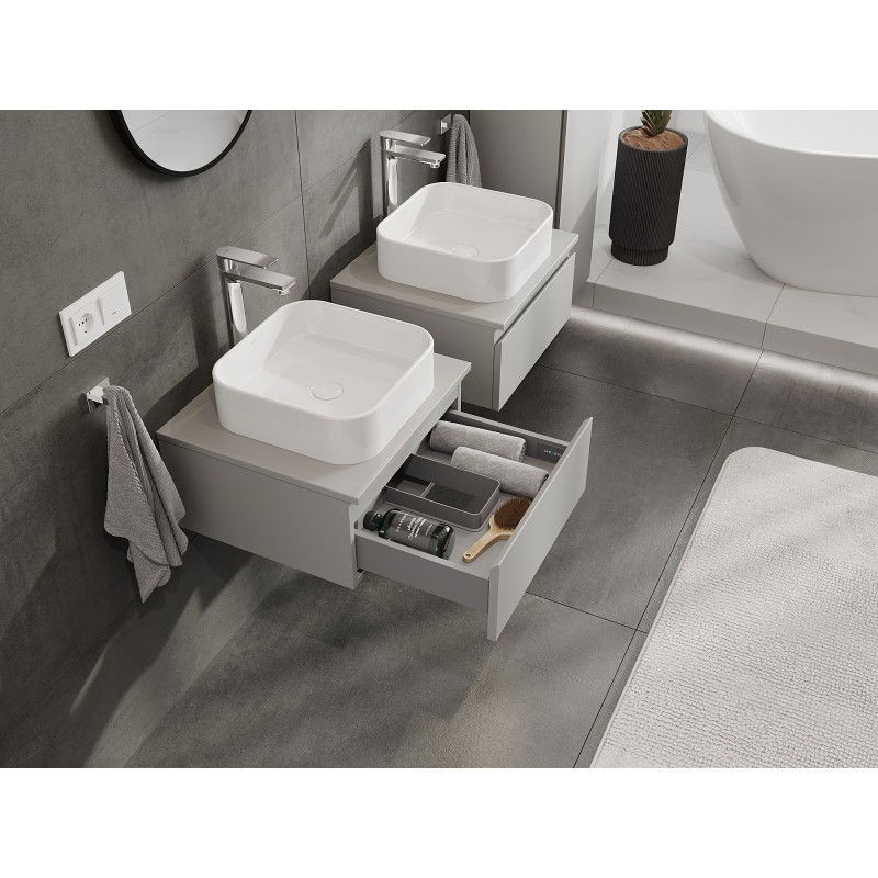 Specifikace produktu: Rozměry skříňky: Šířka: 50 cm Výška: 23,5 cm Hloubka: 46 cm Barva korpusu: Matně šedá Materiál korpusu: Lakovaná deska Barva čela: Matně šedá Materiál čela: Lakovaná MDF deska Struktura čela: Hladká Počet zásuvek: 1 Prostorná zásuvka s funkcí tlumeného dovírání Plný výsuv pro snadný přístup k obsahu zásuvky Povrch odolný vůči UV záření Rozměry pracovní desky: Šířka: 50,6 cm Hloubka: 46,5 cm Tloušťka: 1,8 cm Barva pracovní desky: Matně šedá Materiál pracovní desky: Lakovaná MDF deska Povrch odolný vůči UV záření Ideální jako podstavec pro umyvadla na desku Sestavený produkt