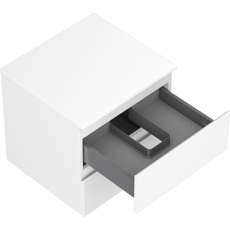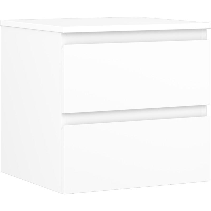 Specifikace produktu: Rozměry skříňky: Šířka: 50 cm Výška: 47 cm Hloubka: 46 cm Barva korpusu: Matná bílá Materiál korpusu: Lakovaná deska Barva čela: Matná bílá Materiál čela: Lakovaná MDF deska Struktura čela: Hladká Počet zásuvek: 2 Prostorná zásuvka s funkcí tlumeného dovírání Plný výsuv pro snadný přístup k obsahu zásuvky Povrch odolný vůči UV záření Rozměry pracovní desky: Šířka: 50,6 cm Hloubka: 46,5 cm Tloušťka: 1,8 cm Barva pracovní desky: Matná bílá Materiál pracovní desky: Lakovaná MDF deska Povrch odolný vůči UV záření Ideální jako podstavec pro umyvadla na desku Sestavený produkt